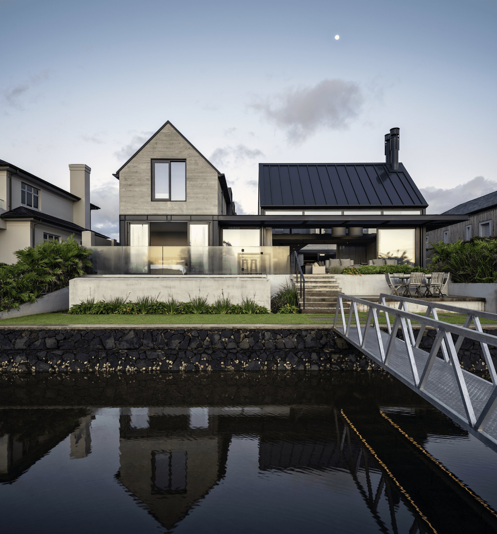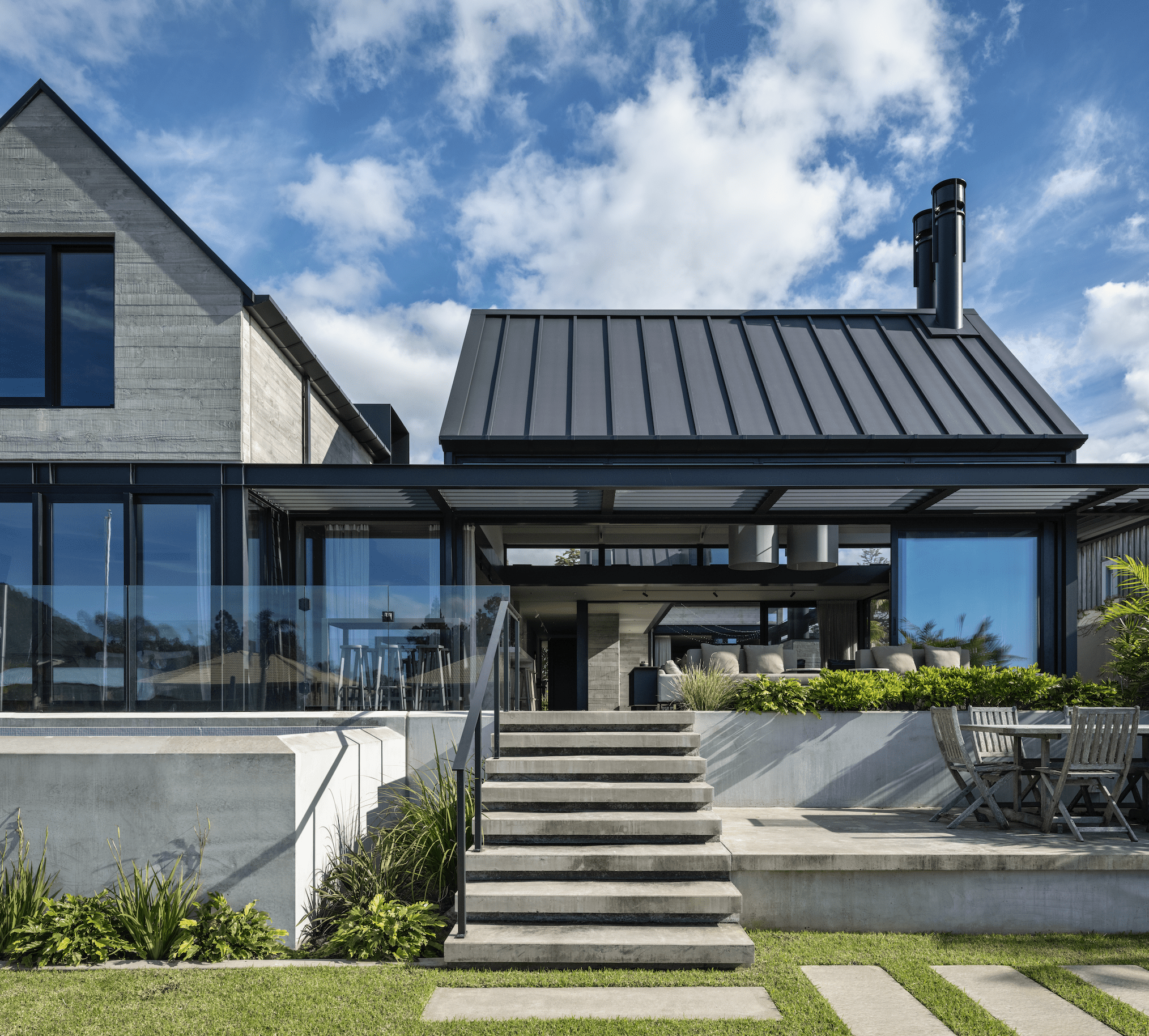 It’s not often that dormer windows and brutalism are aligned in the same building, but this house on the Pauanui Waterways is not your usual combination of architectural ingredients.