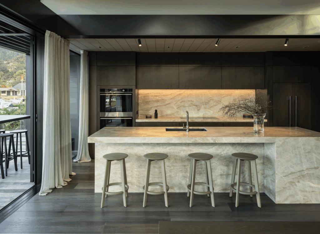 While the structural framework is strongly expressed, it is counterweighted by the gentle elegance of the interior. Johnston Architects worked alongside Bespoke Interior Design to introduce a muted palette in features such as the Taj Mahal granite on the waterfall island bench and splashback and the diesel-toned timber floors.