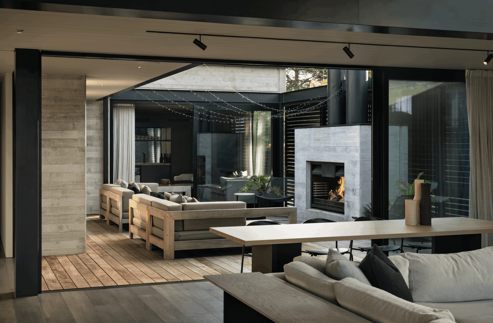 The geometries of structure intersect the volumes: horizontal beams create a datum line around the communal living/dining and kitchen area, while two fireplaces — one in, one out — carved from the same shuttered concrete, provide vertical elements.