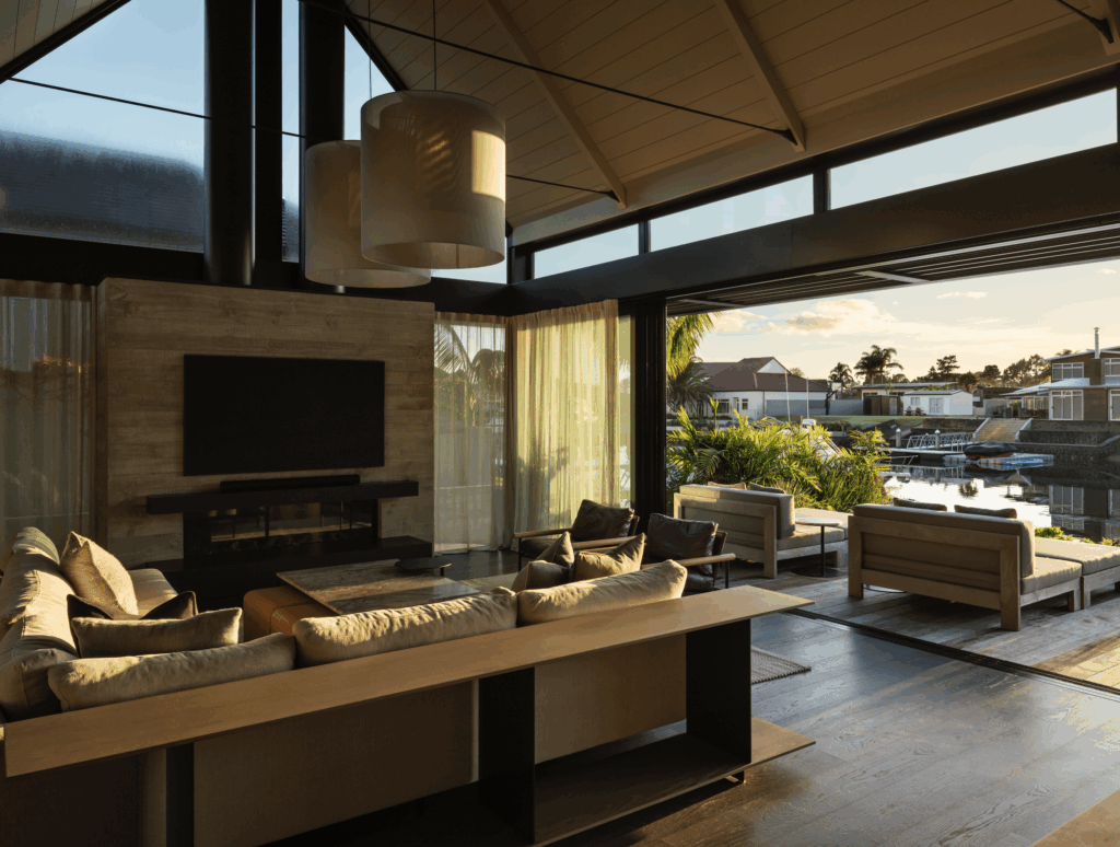 A flat, waterfront site is a dream come true, but the challenge was to fit a full programme, including four bedrooms and an office, onto the 700-square metre section, without compromising outdoor living.
