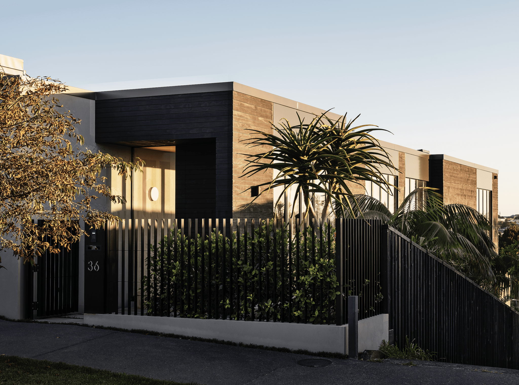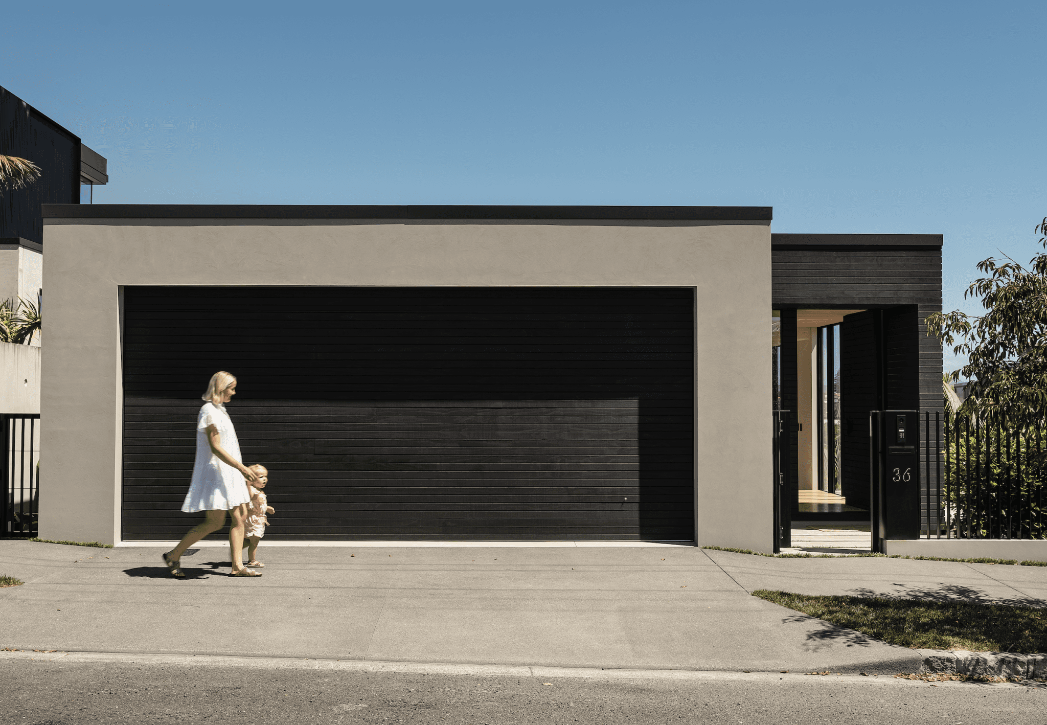 Here, the garage and pedestrian entry are wrapped in a light charcoal grey plaster and black-stained horizontal Accoya timber — the latter also wrapping the bulk of the other elevations.