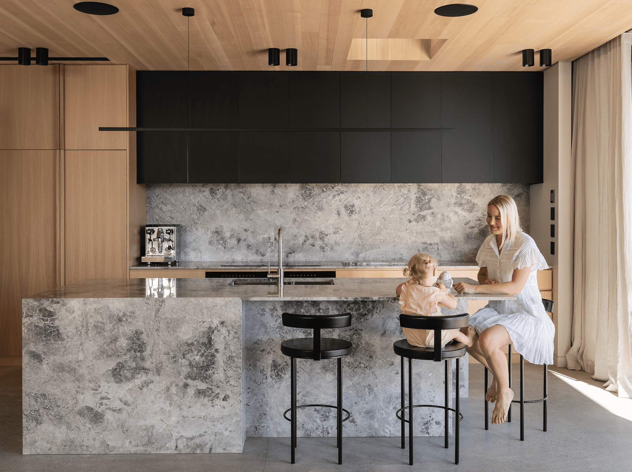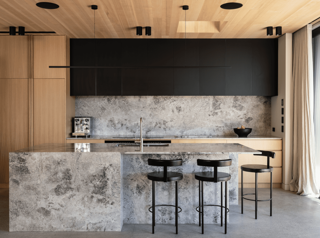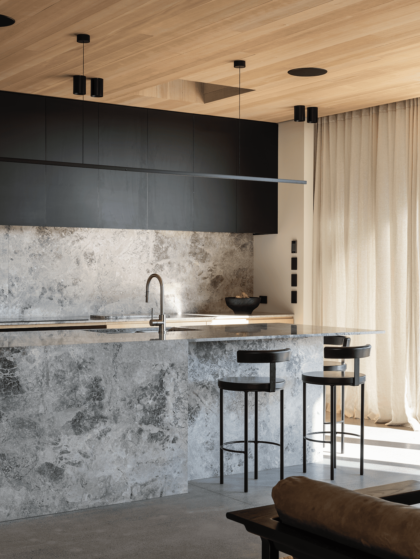 “We worked really hard to make sure this space had a vivid softness to it. The concrete floor is beautiful — a light charcoal grey. The kitchen island is carved from tundra limestone; it’s slightly recessive in the space yet retains its own character. We’ve also let different timbers sit alongside one another, while black overhead kitchen cabinetry provides a visual contrast, and echoes a dark polished plaster finish above the fireplace. By limiting the palette to three key elements: concrete, timber, and the black accents, it flows. There’s a harmony to the space; it feels relaxed, calming, and full of warmth and texture.”