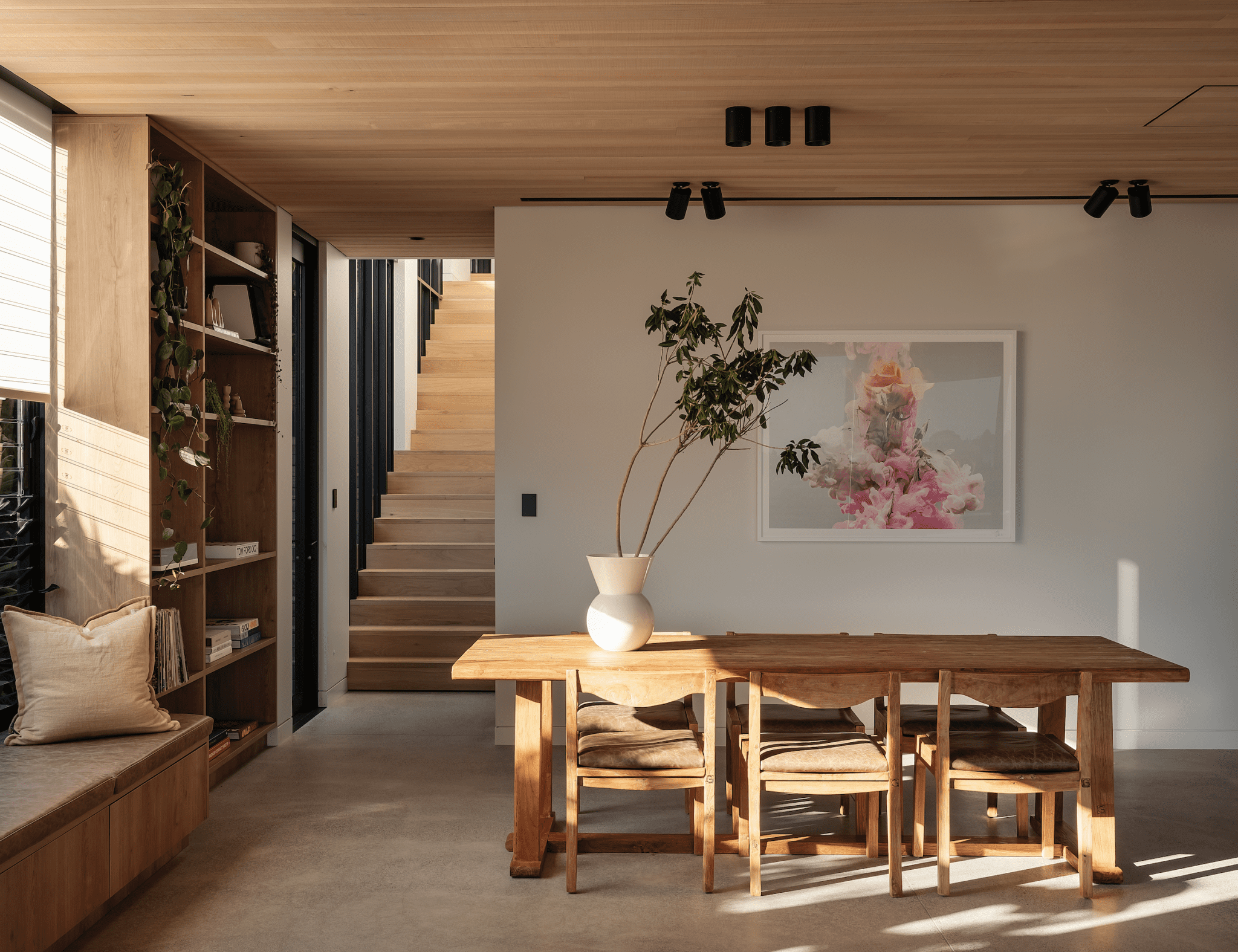 Looking back at the house from across the estuary, it is hardly visible. The black-stained Accoya disappears into the bush and planting that surrounds it — not unlike the manner in which the outside world falls away as you descend into the southern heart of this home.