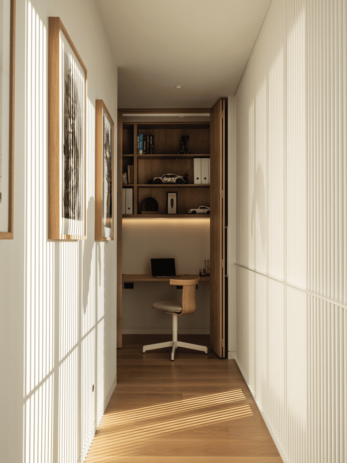 “When you reach the bottom, the experience is twofold. A lower ceiling creates a human scale, while the materials create a warmth. There’s a beautiful softness. You breathe out when you get there; it’s as if you’re arriving home at that point,” the architect tells us.