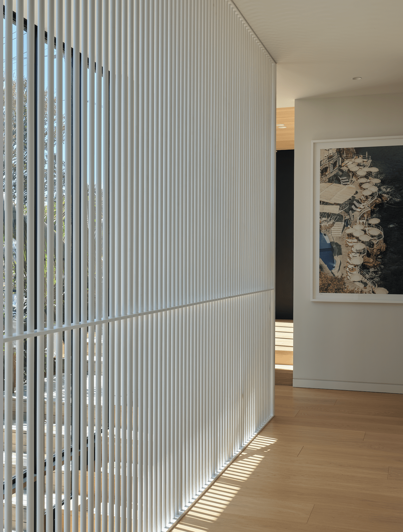 “We decided to introduce a feminine element here, of round white rods with spacing, that ensures an outlook is maintained while privacy is created from onlookers. It offers some reprieve from the sun but also amazing light patterns.”