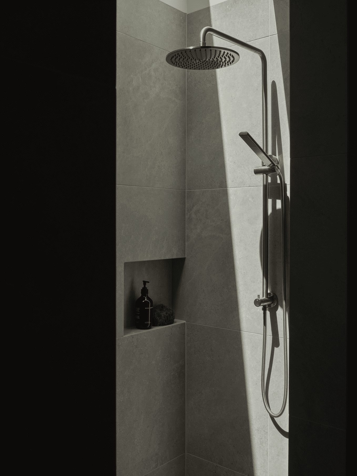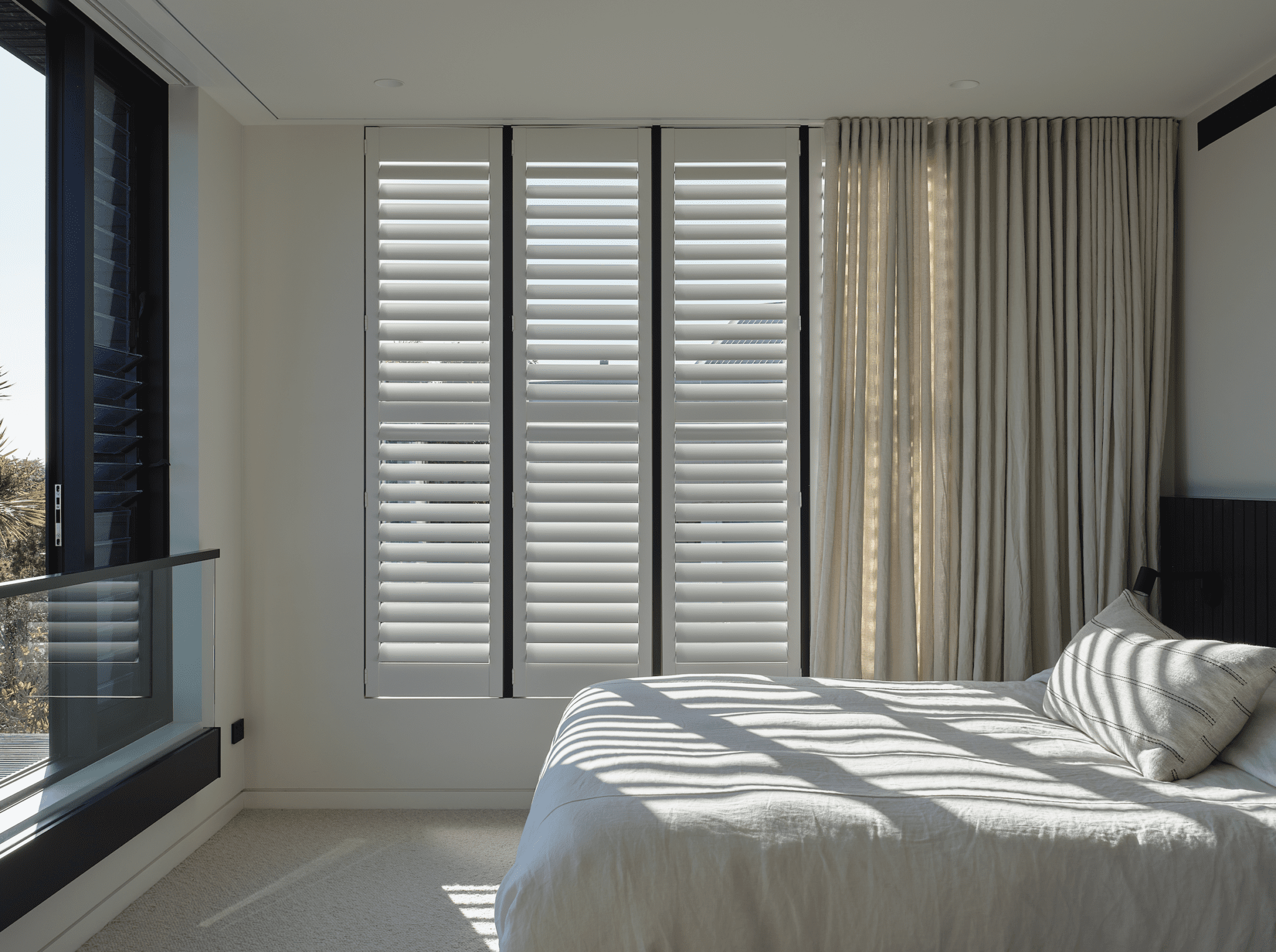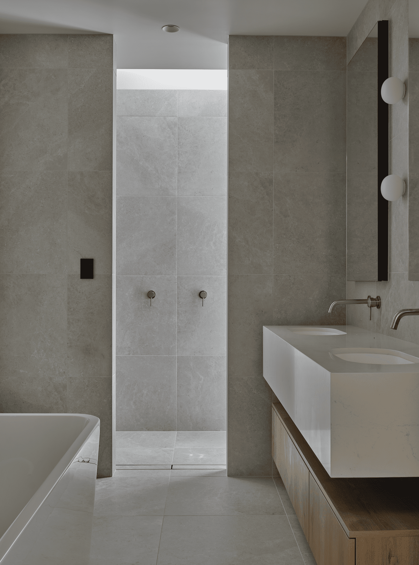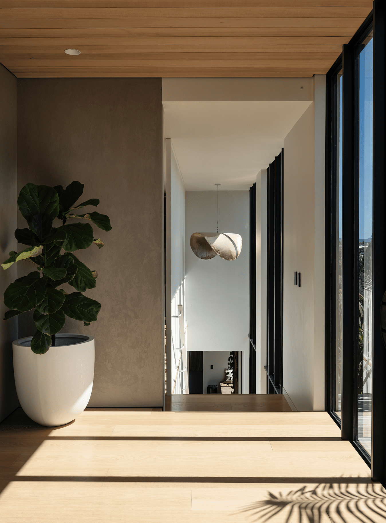 Enter the house and the initial experience is one of simple, pared-back materials. Stepped half a level down is the bedroom wing. The main bedroom faces south, where captivating views unfold and ultimately define the experience of both the bedroom and en suite.