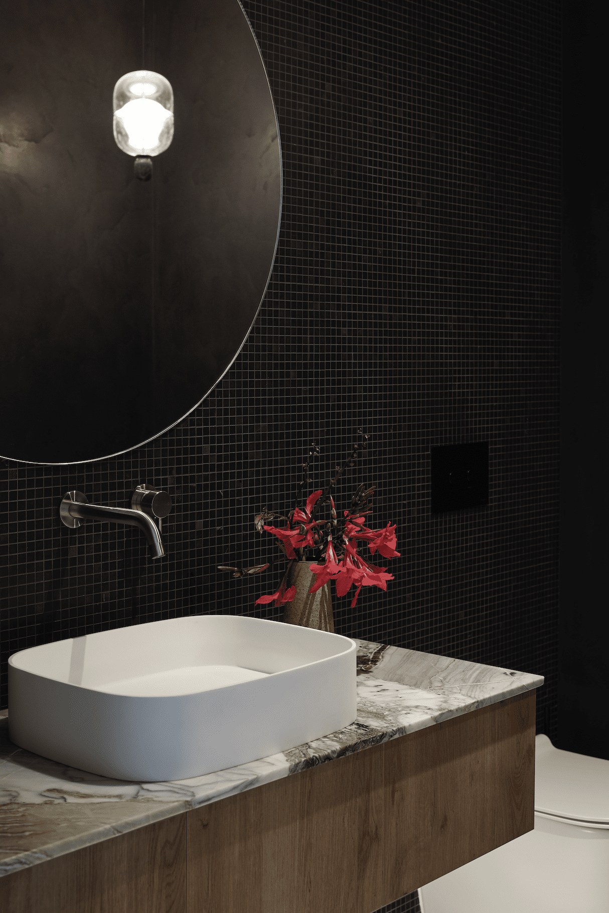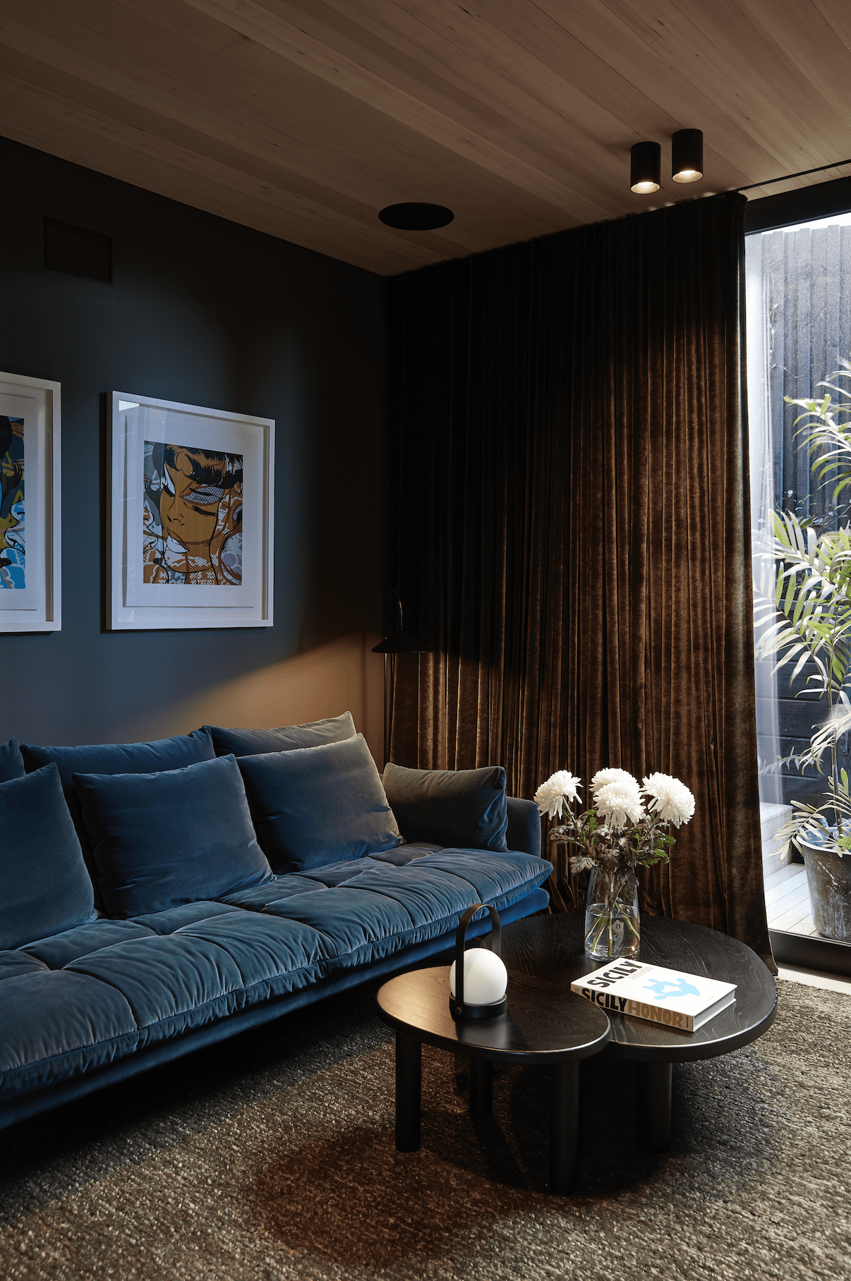Tucked away to the east, behind a concealed door, is a room the clients specifically outlined in their brief: a ‘gin room’. The resulting space is a marked departure from the light-toned sophistication of the main entertaining area. Here, in what has become everything from an adults’ retreat to a media room, and the much-anticipated gin room, the aesthetic is moody and dark. Deep-green velvet curtains meet walls of a similar verdant green, while black cabinetry offers a complete juxtaposition to the light timber of the rest of this level.