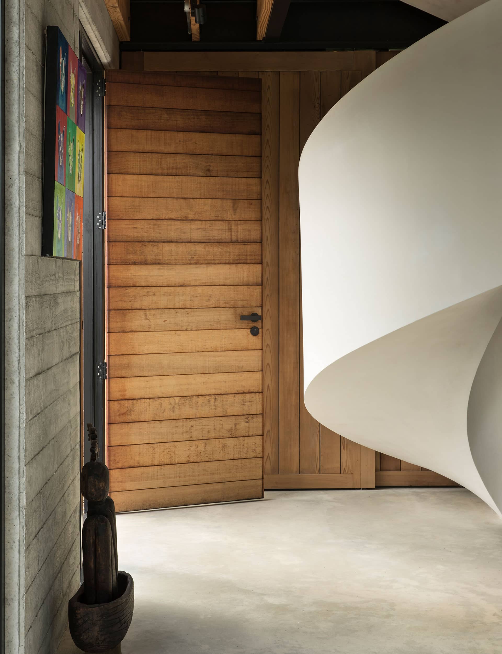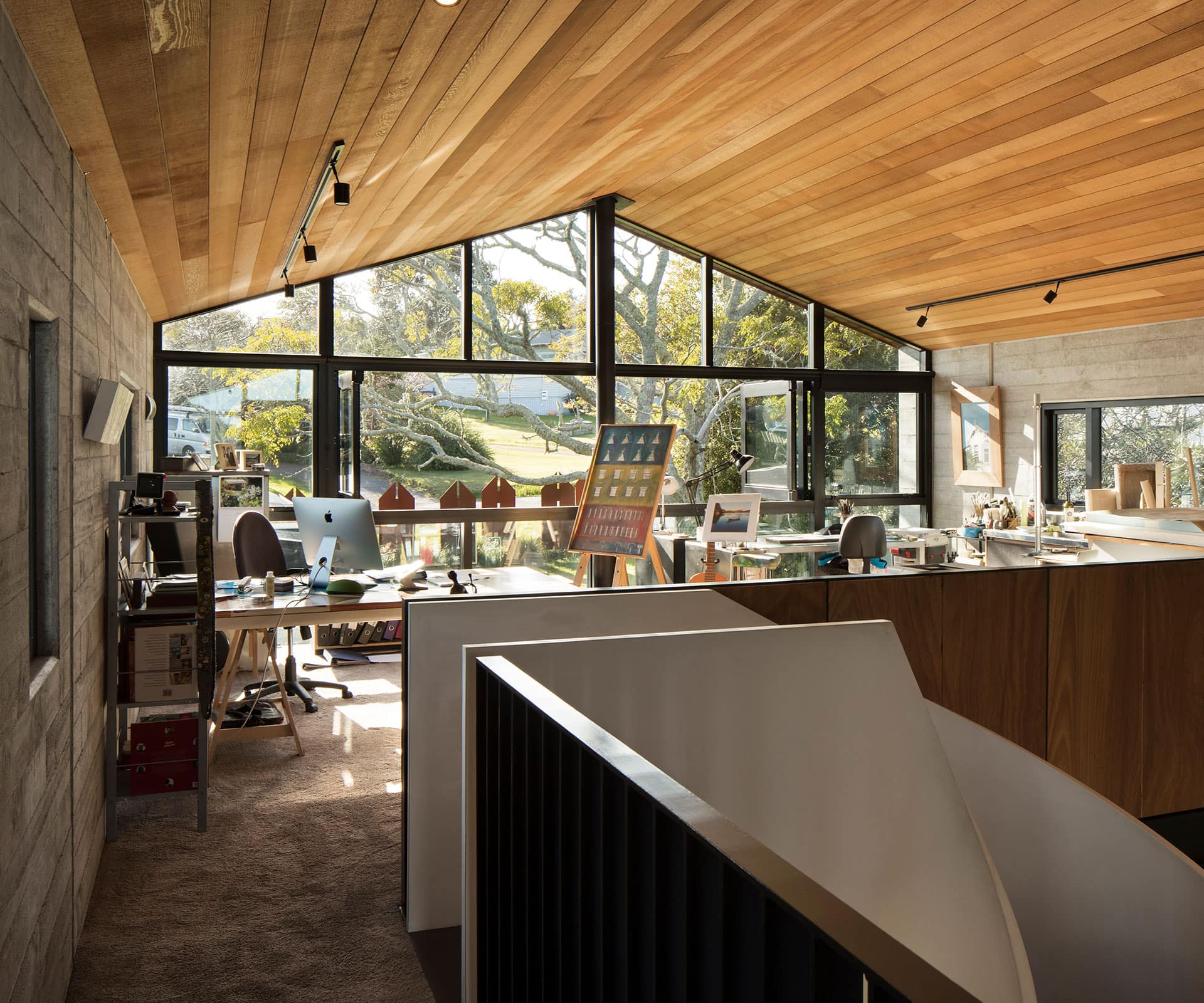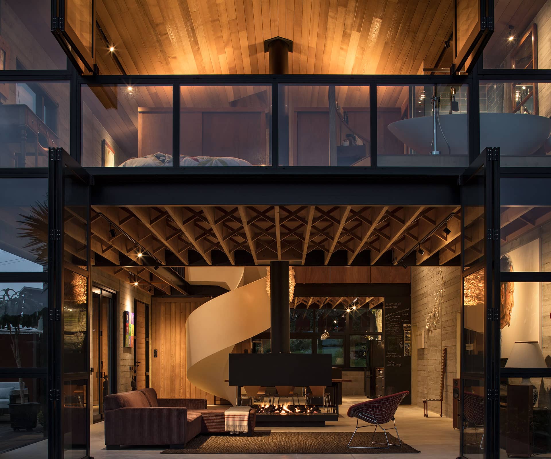 A soft spiral staircase helped achieved the perfect balance in an industrial Waiheke home that’s “part cathedral, part boatshed”
