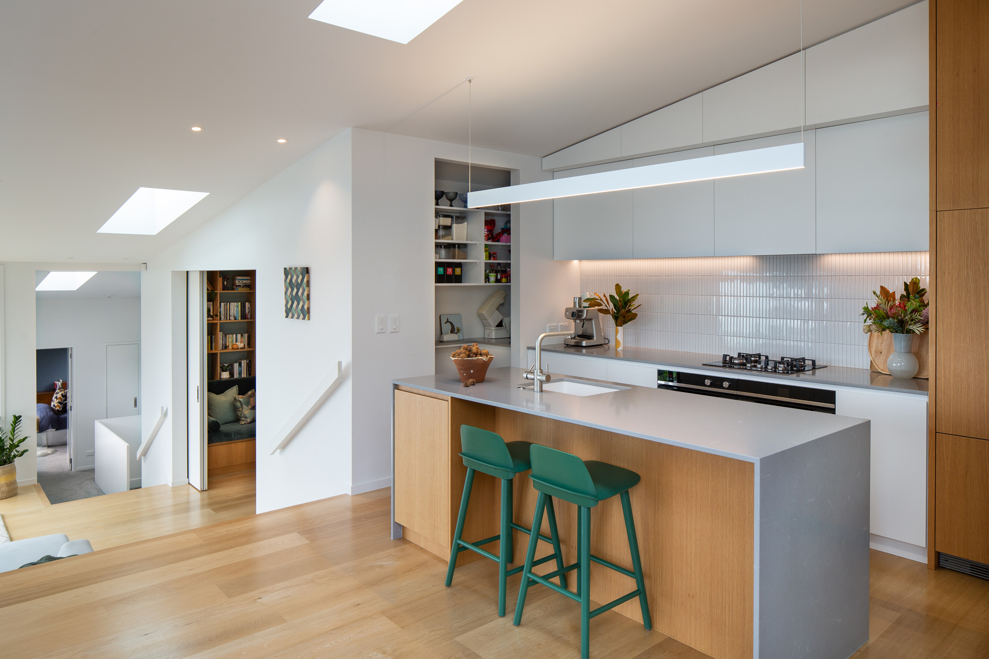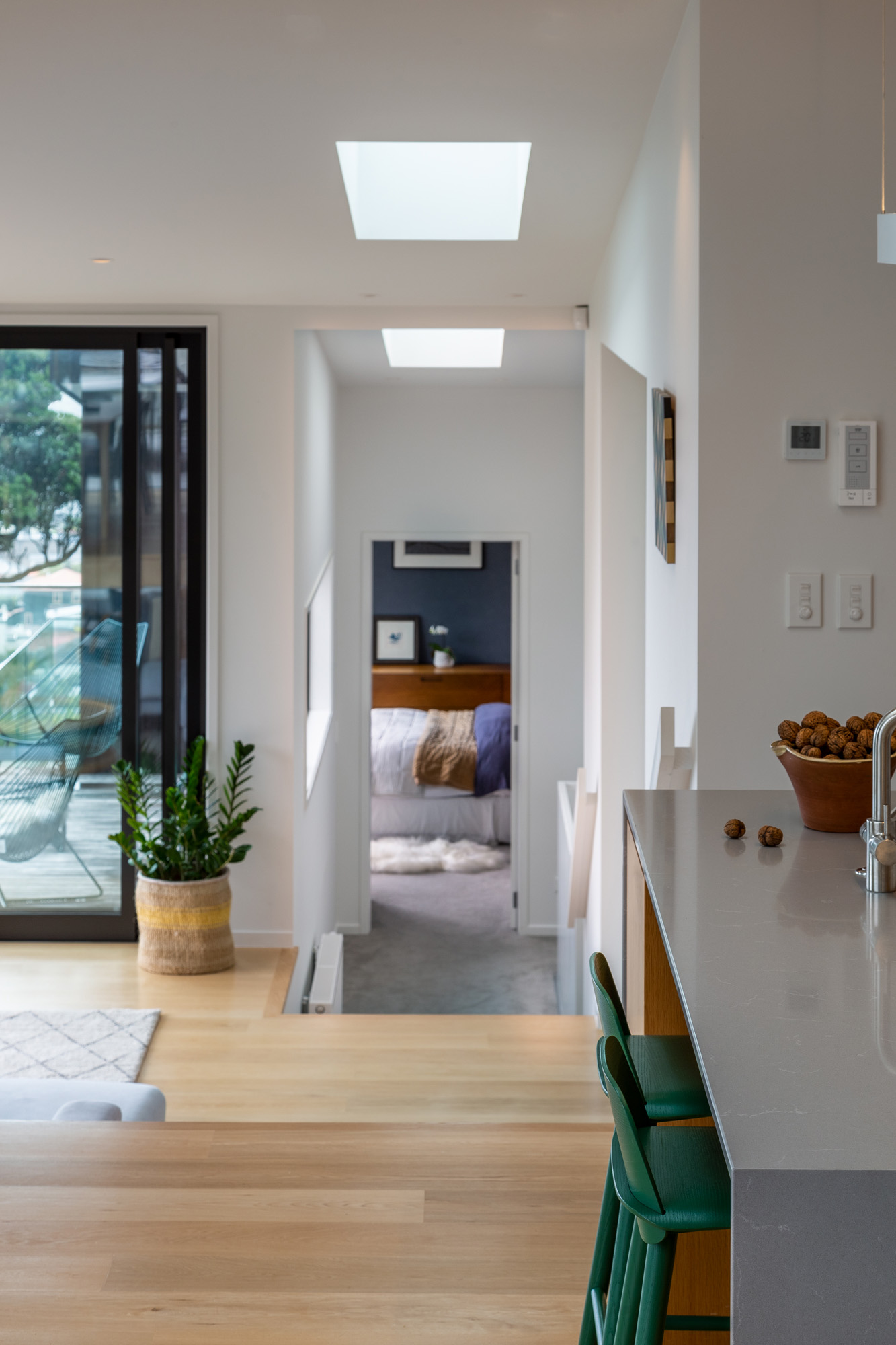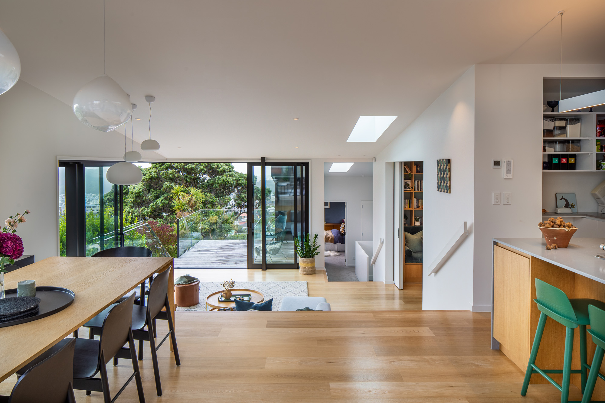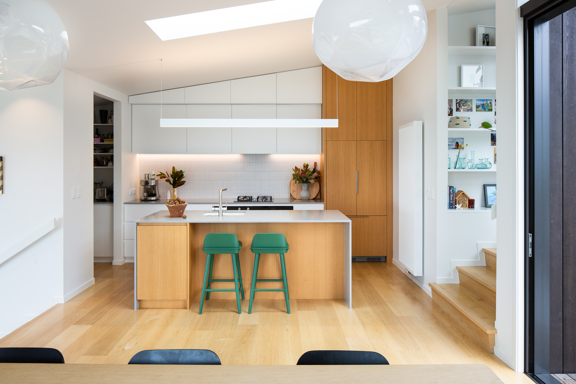 Oak flooring and white walls contribute to a restrained material palette that reflects the hues of the natural surrounds; Nerd Bar Stools from Bauhaus add a pop of colour.