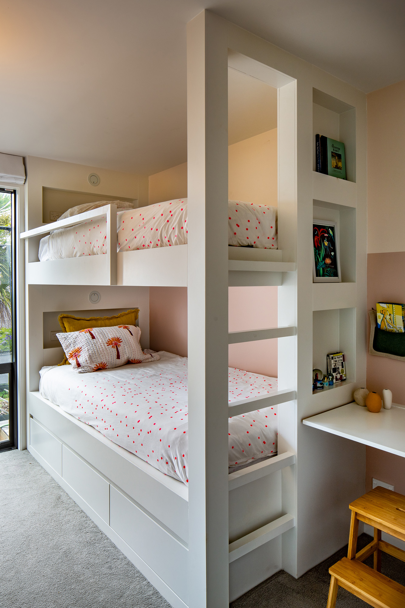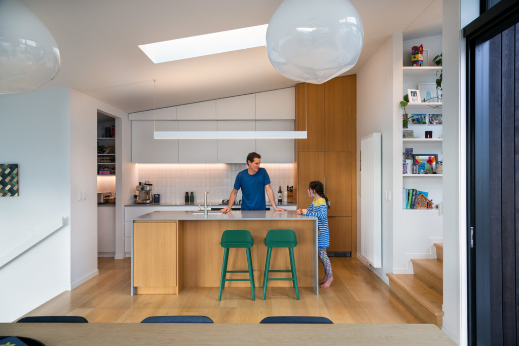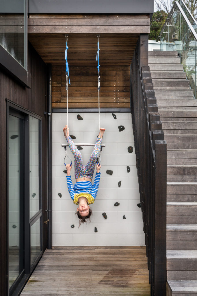 Providing an interesting backdrop to home office Zoom meetings are the climbing wall and gymnastic rings on the lower decked area — a novel concept by the clients for their daughters, aged 8 and 10, and a happy new spin on the phrase “the kids are climbing up the walls”. Ali’s garage workshop has been taken over by the children as an arts and crafts area, and they sometimes camp out there overnight — this is Wellington, after all, where even tents are inside — further playfully blurring the lines between the interior and exterior of this understated, respectful urban house.