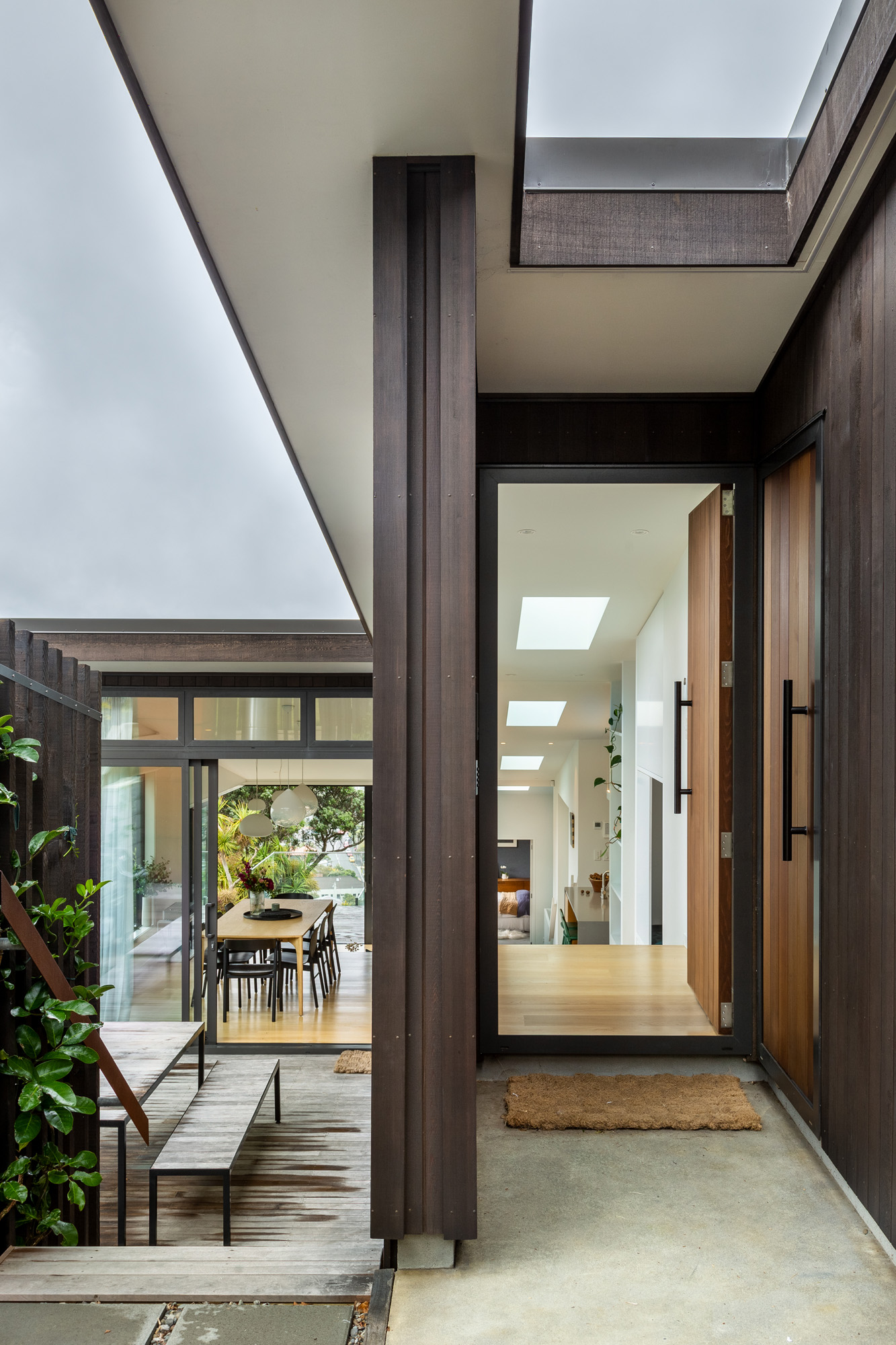 The house is screened from the street by an outdoor service area, while at the entrance a timber door is combined with a Windsor hardware pull handle and lit from above with an exterior skylight.