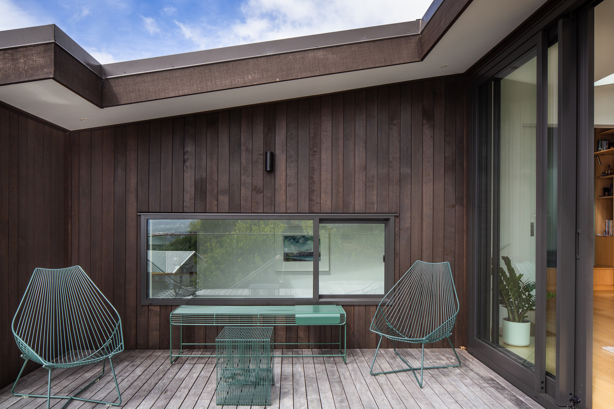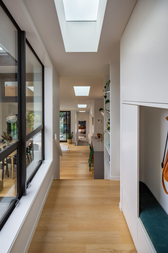 The cladding is low-maintenance, dark-stained cedar. Internally, it’s much lighter, with oak flooring and white painted walls. The restrained material palette reflects the vegetation of the various nearby parks and reserves — splashes of green feature on some of the furniture and radiators.