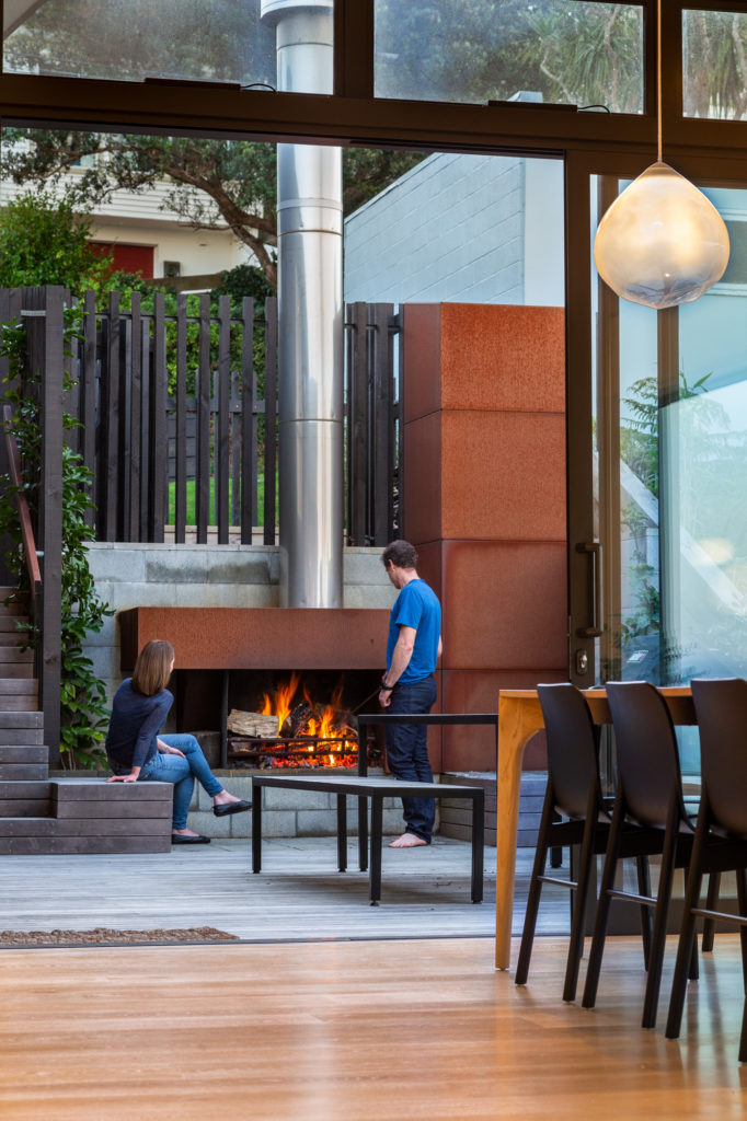 The minimalist street frontage creates a sense of privacy but also intrigue as to what lies beyond it. The house is screened from the street by the garage and an outdoor service area, which has a hot shower where the family can hose themselves and their bikes down before entering the house. Just below that, in the first courtyard, is a fireplace with a Corten steel wood hopper and a tall protruding flue — a mini-me handcrafted Corten steel postbox sits above it — where the clients sit out in winter and eat in the summer.