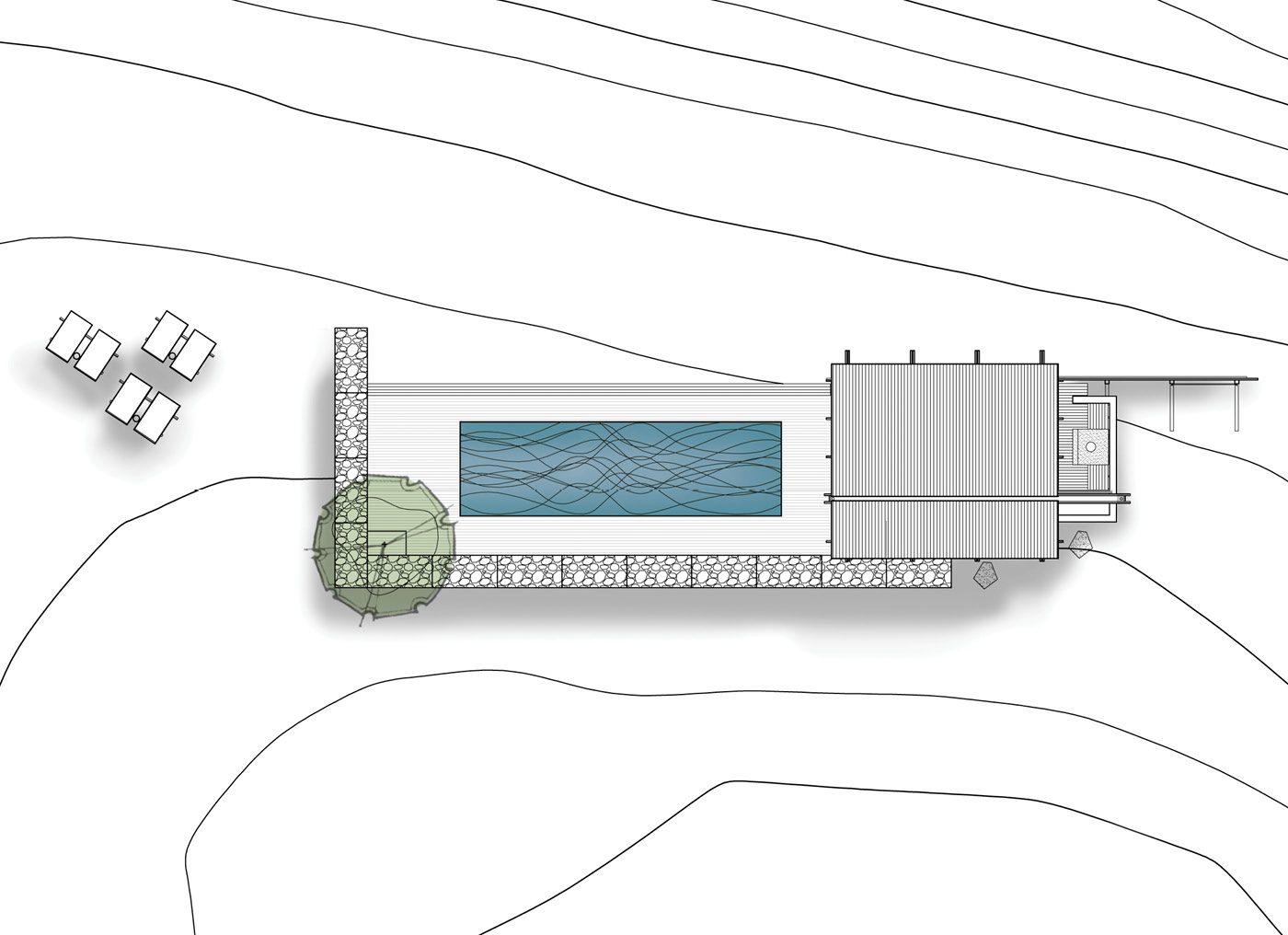 Nicola Herbst We created shelter to the southwest to enable the building to look out over the water and the swamps and hills beyond. With such large sweeps of view you want to tease the building out into the landscape as much as possible so it has a bit of stature. We liked the idea of using very rough materials as the palette to work with, so the building has a strong natural agrarian feel to it. With pools you also have to solve the fencing and safety issues, so we worked with the site and elevated the structure so no fencing was required at the front.