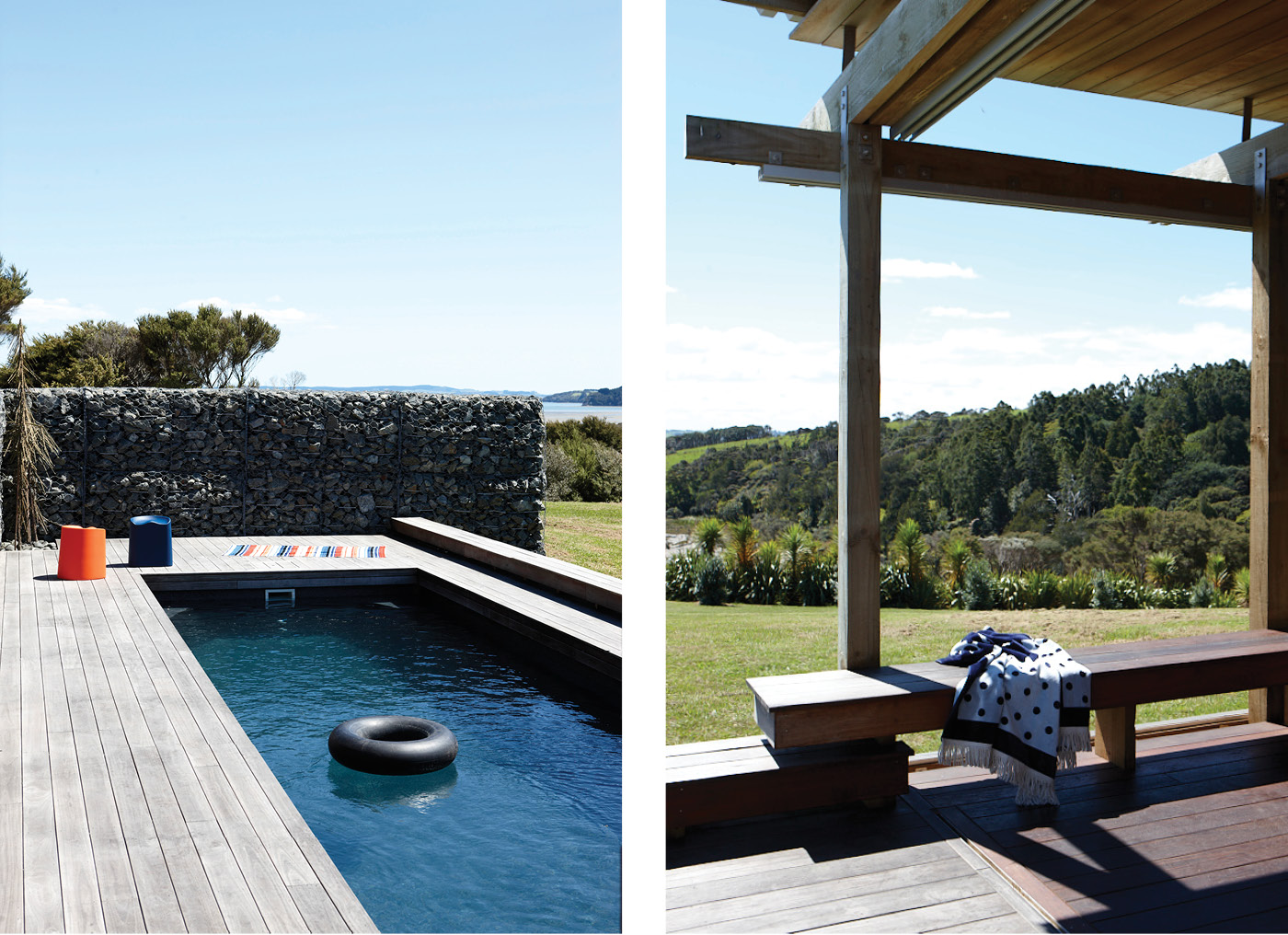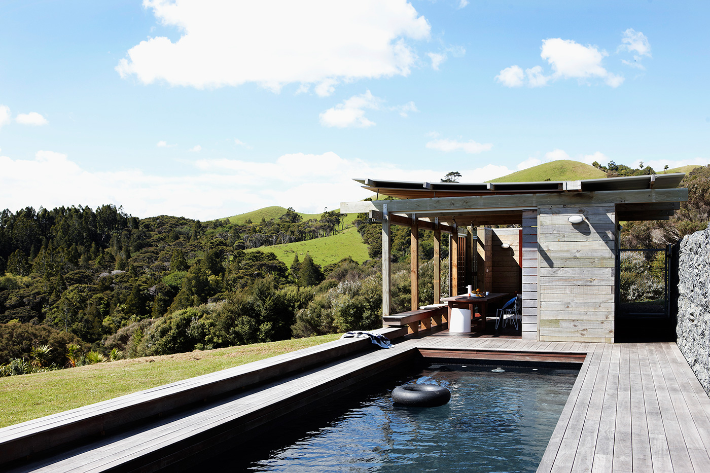 From the pool and its simple, charming pavilion, the owners can take in sweeping views of the Kaipara Harbour and the surrounding countryside