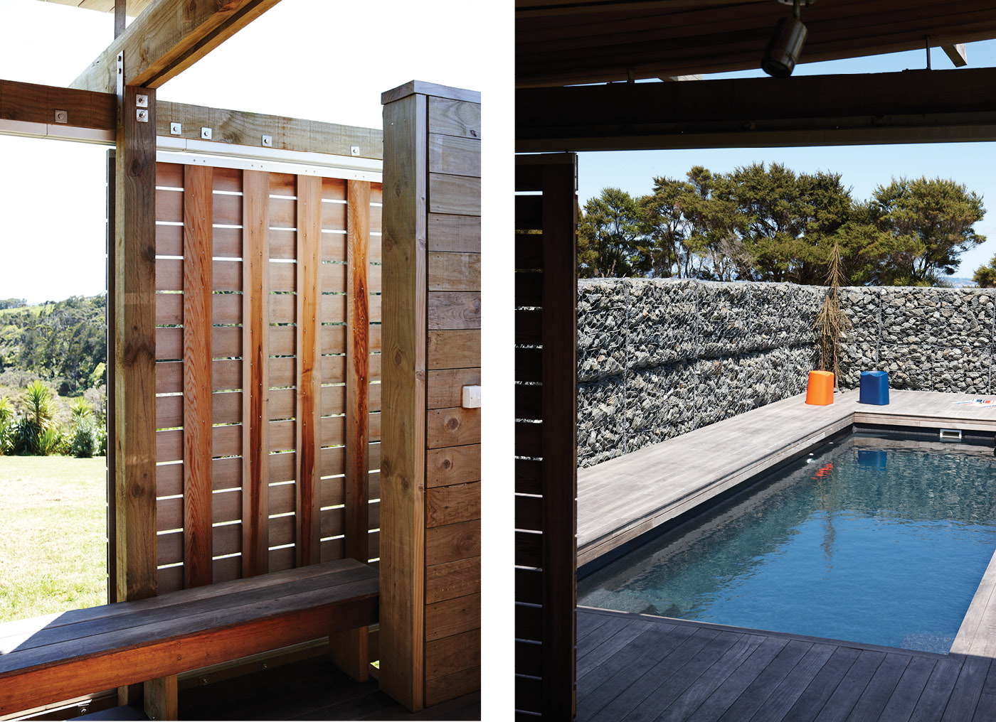 The Herbsts began work with a minimal budget and the pool dimensions already set. They established a strong gabion-wall backbone to shelter the pool from prevailing southwesterly winds. Then they worked to “tease the building out into the landscape as much as possible so it had a bit of stature,” Nicola says.
