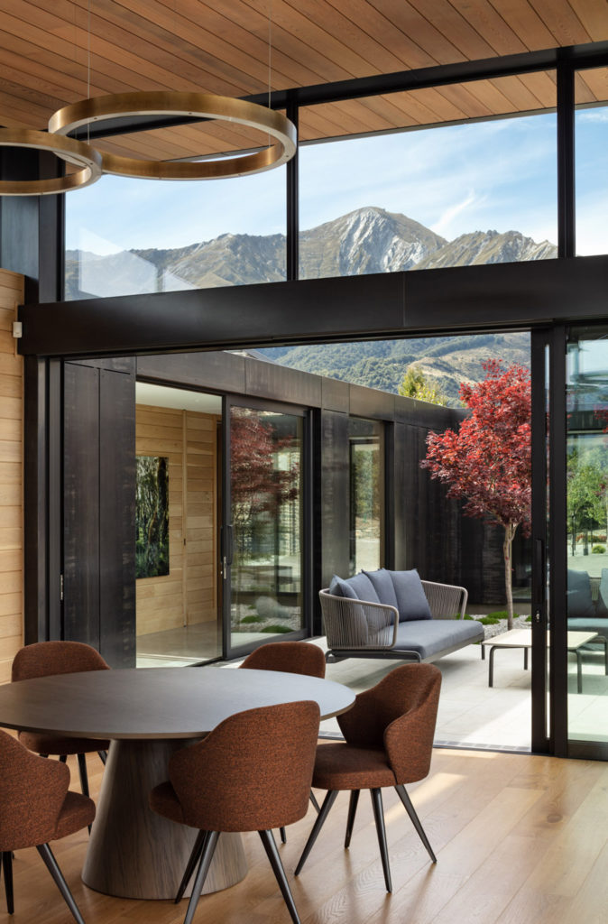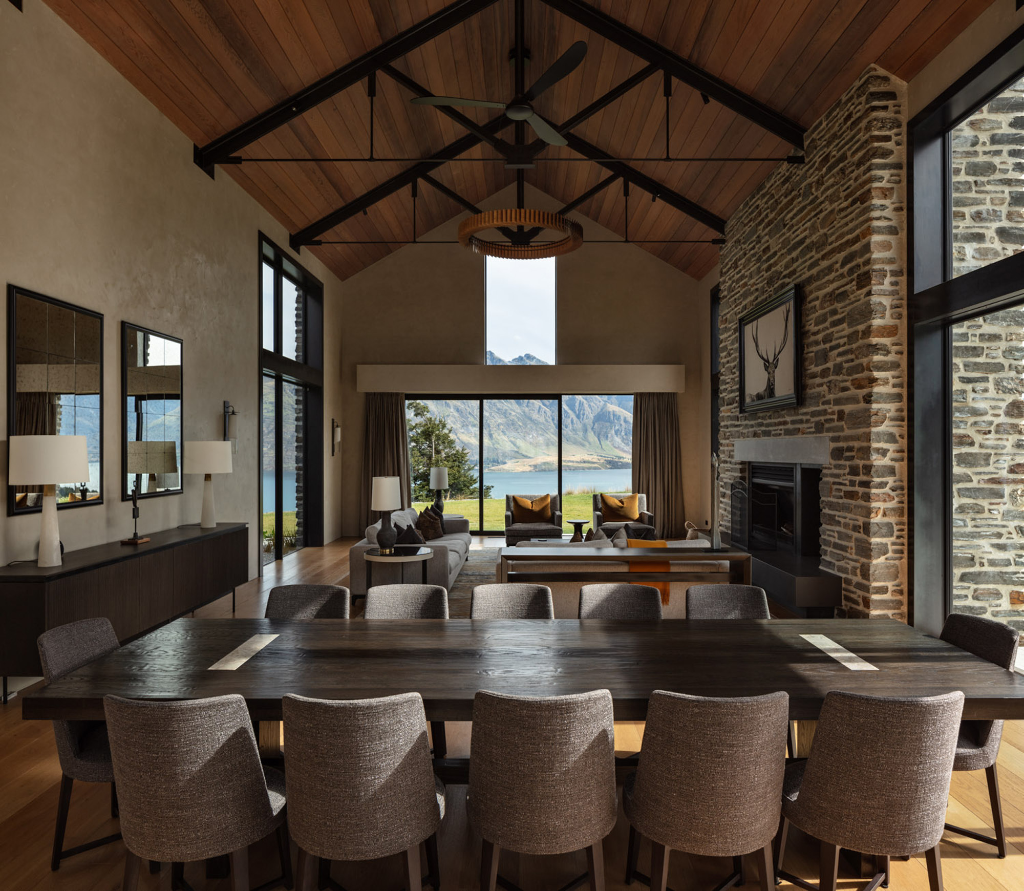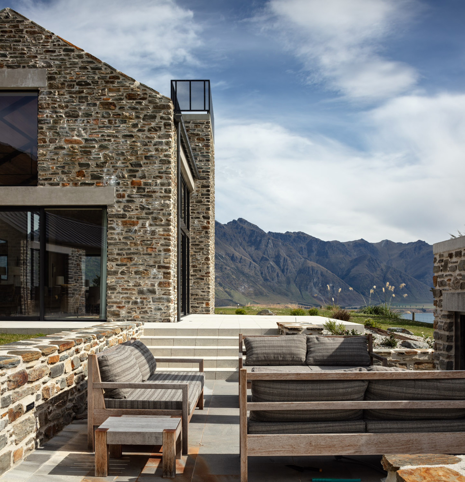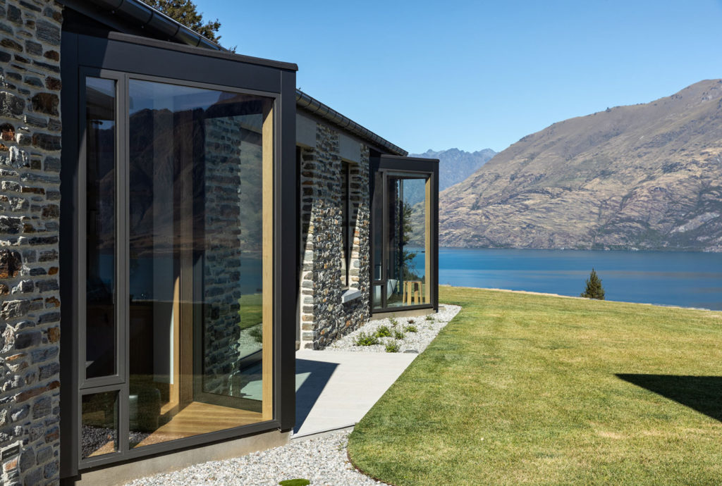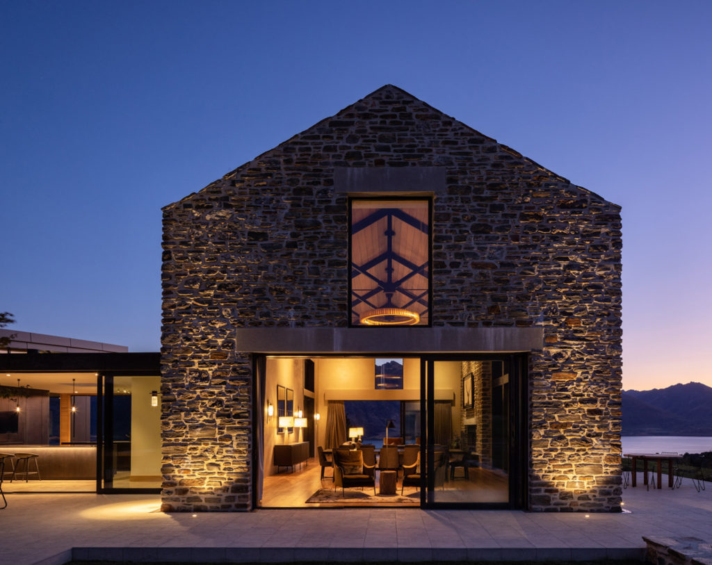 “The idea was to place these stone barns on a plateau overlooking the lake below” — with a backdrop that includes Cecil and Walter Peaks, the Remarkables and Mount Crichton, Mount Hanley and Home Hill in the distance providing an ever-changing, rugged canvas for sunset hues.