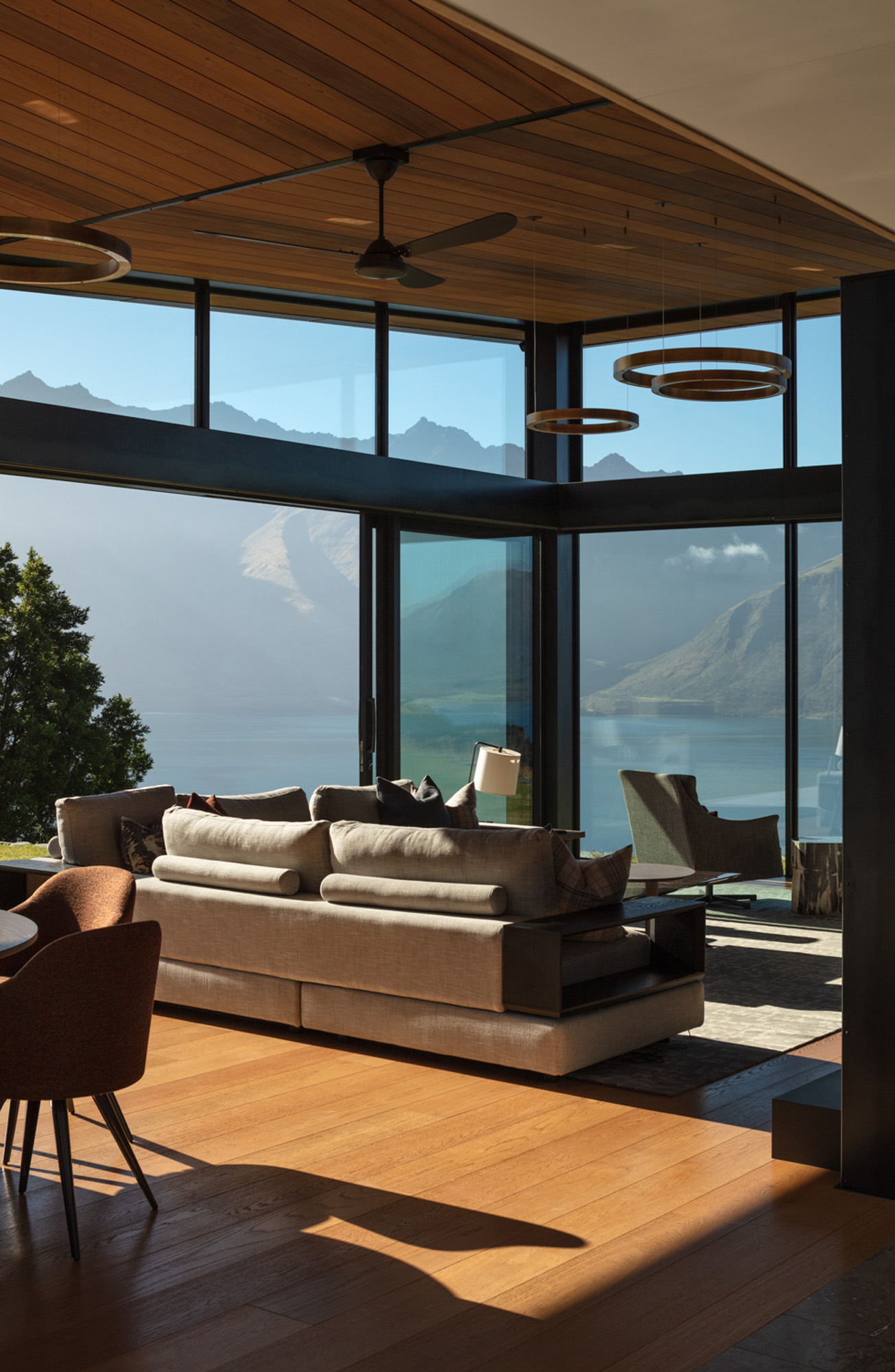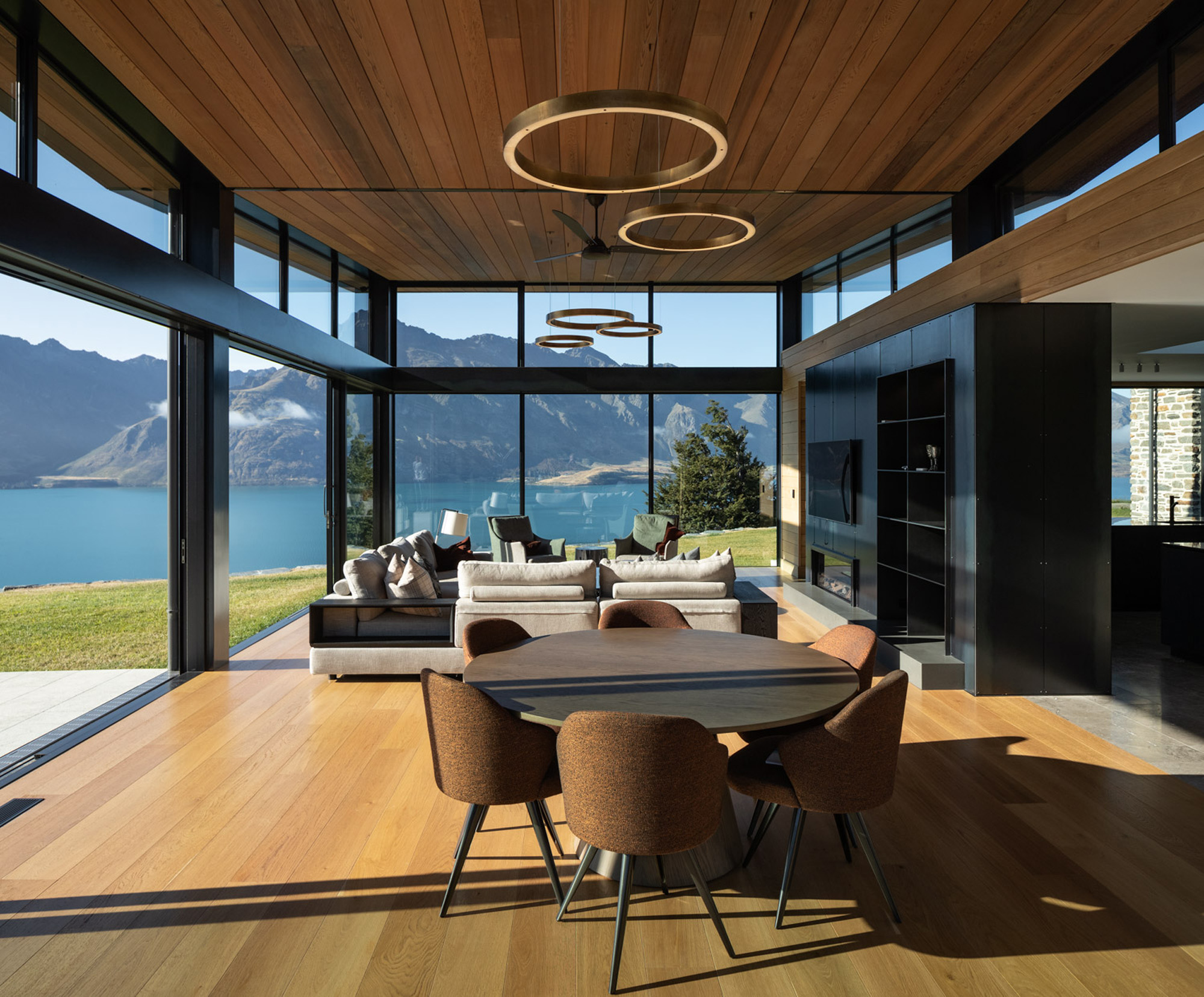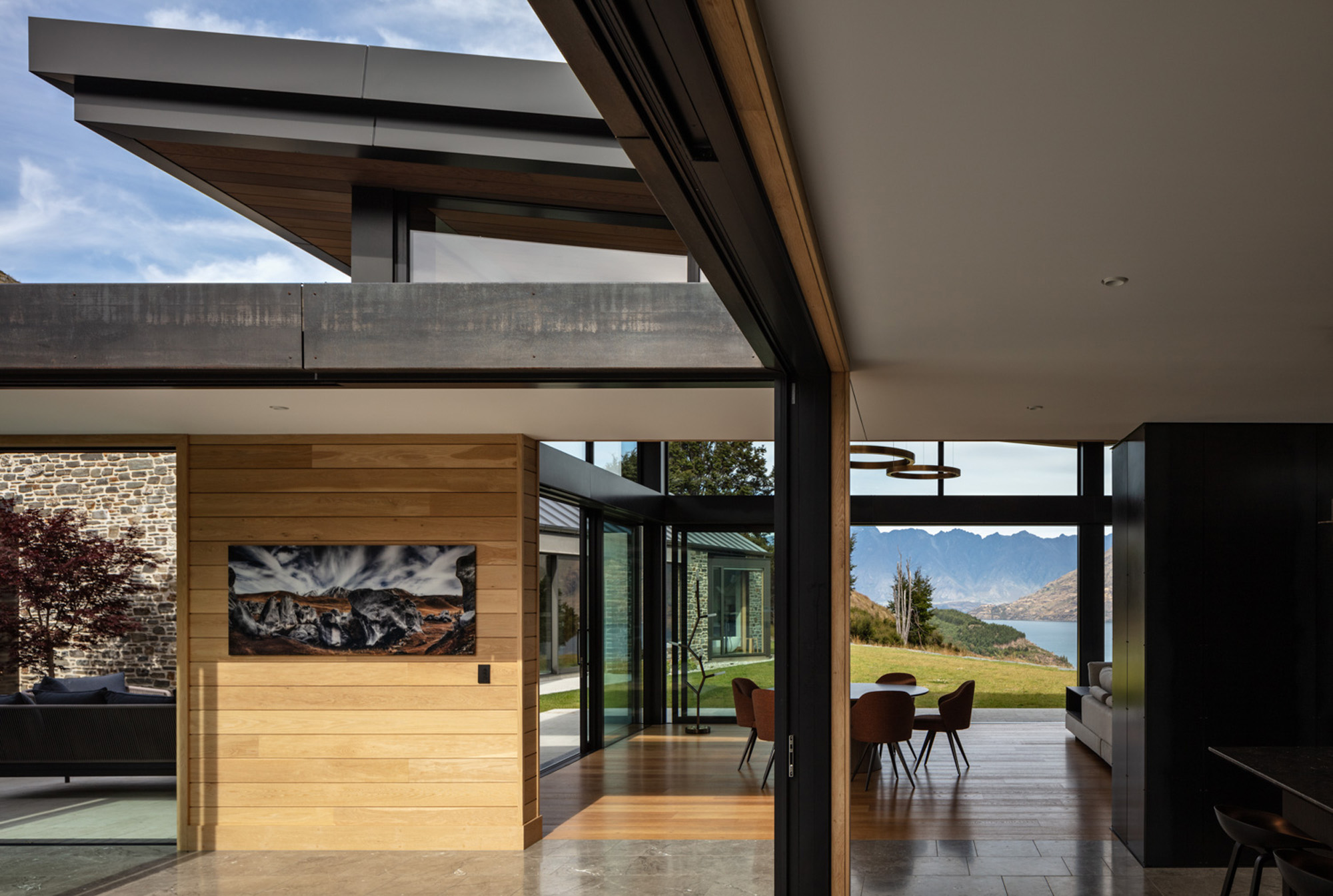 “The idea was to place these stone barns on a plateau overlooking the lake below” — with a backdrop that includes Cecil and Walter Peaks, the Remarkables and Mount Crichton, Mount Hanley and Home Hill in the distance providing an ever-changing, rugged canvas for sunset hues.