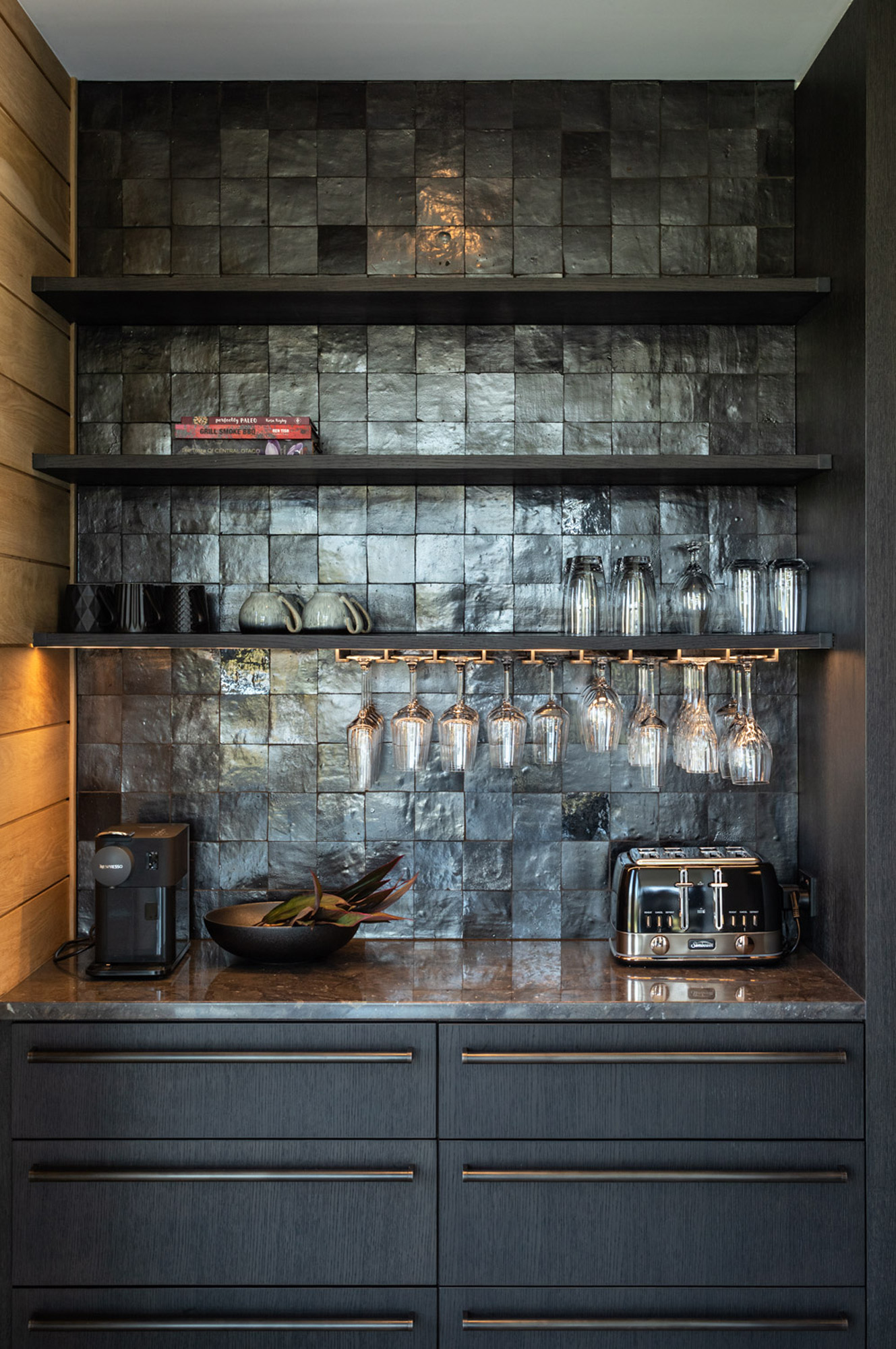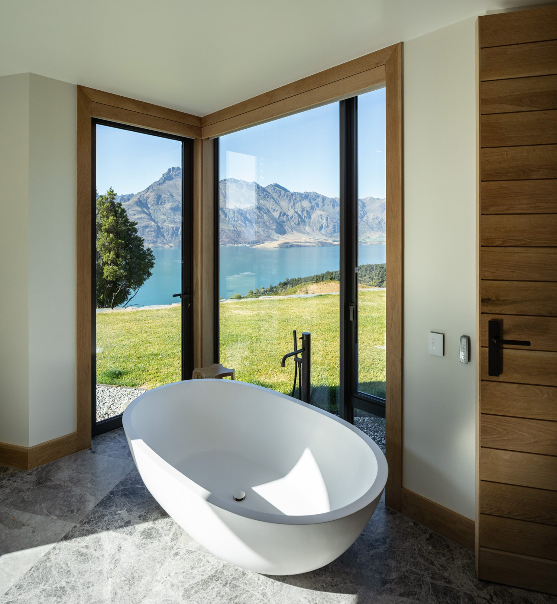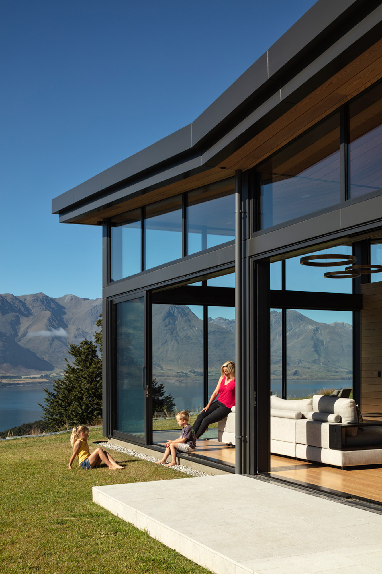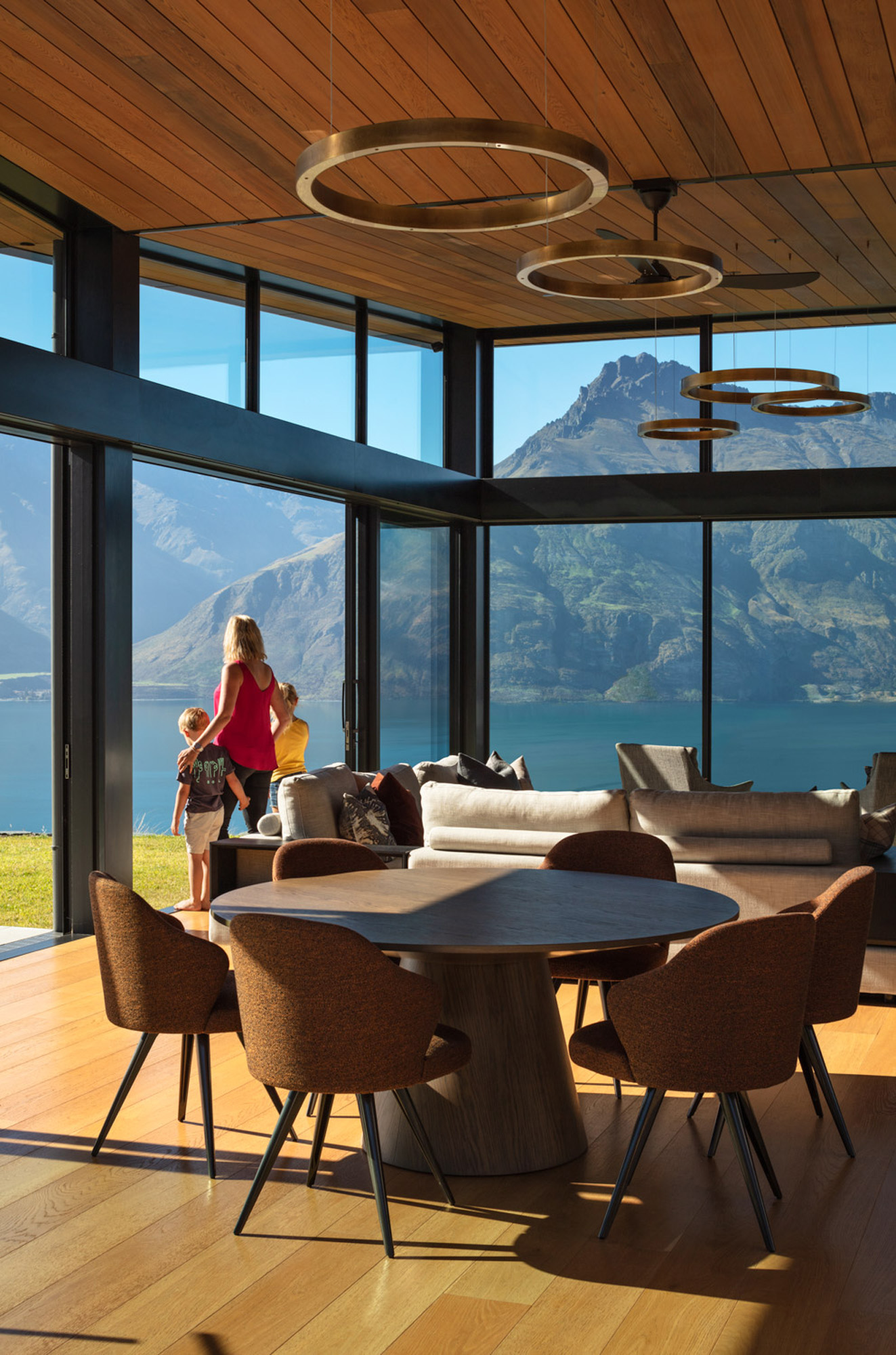 “The idea was to place these stone barns on a plateau overlooking the lake below” — with a backdrop that includes Cecil and Walter Peaks, the Remarkables and Mount Crichton, Mount Hanley and Home Hill in the distance providing an ever-changing, rugged canvas for sunset hues.