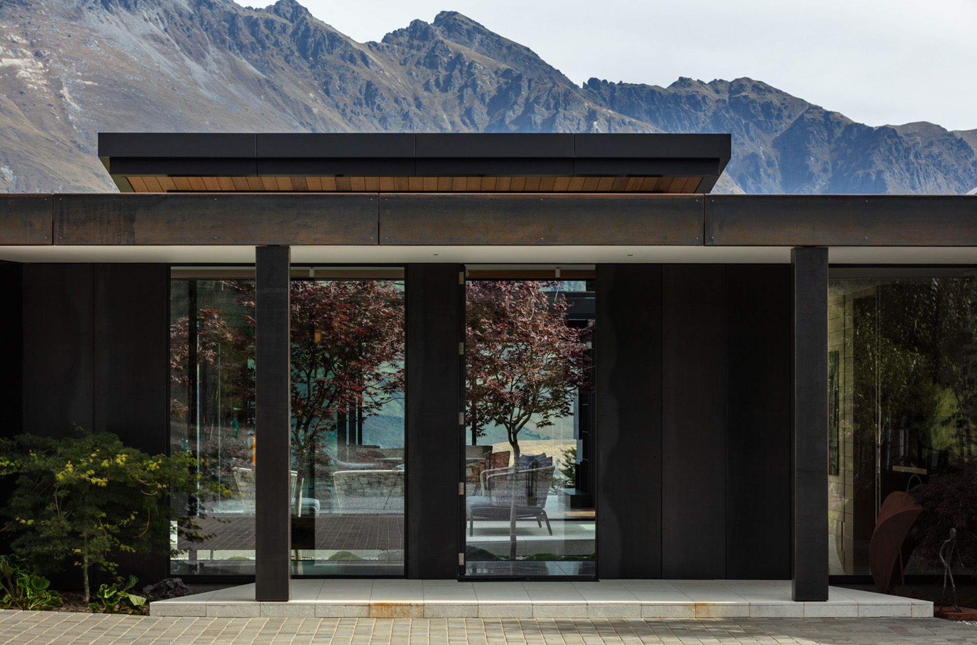 Pastoral stone barns and a black steel butterfly find common ground on an idyllic plateau above Lake Wakatipu.