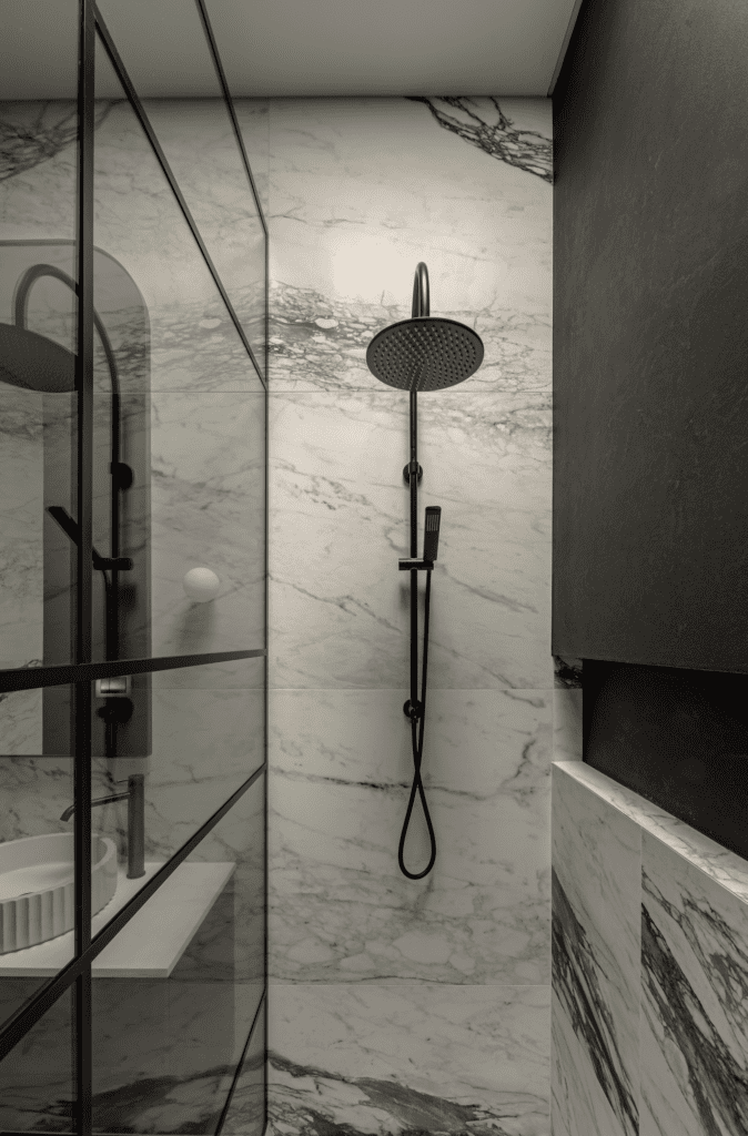 The ‘black and white’ palette with plastered walls and a richly veined floor creates a dynamic and elevated bathing space. The contrast of the light floor wrapping up to meet the dark wall is a particularly inspired choice. A bold, elemental, unique design that is conscious of its heritage context, daring without being over the top, and accomplished on a relatively low budget.