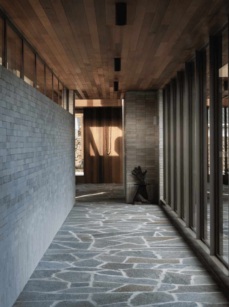 Chunky paving stones lathered with grout are used both out and indoors, a move that translates to durability and a certain ‘unfussiness’. Small, creamy limestone bricks cover the walls horizontally, while a sort of skirting of the same material (but on vertical stacking) that creates a datum line across the whole interior anchors the spaces and provides continuity.