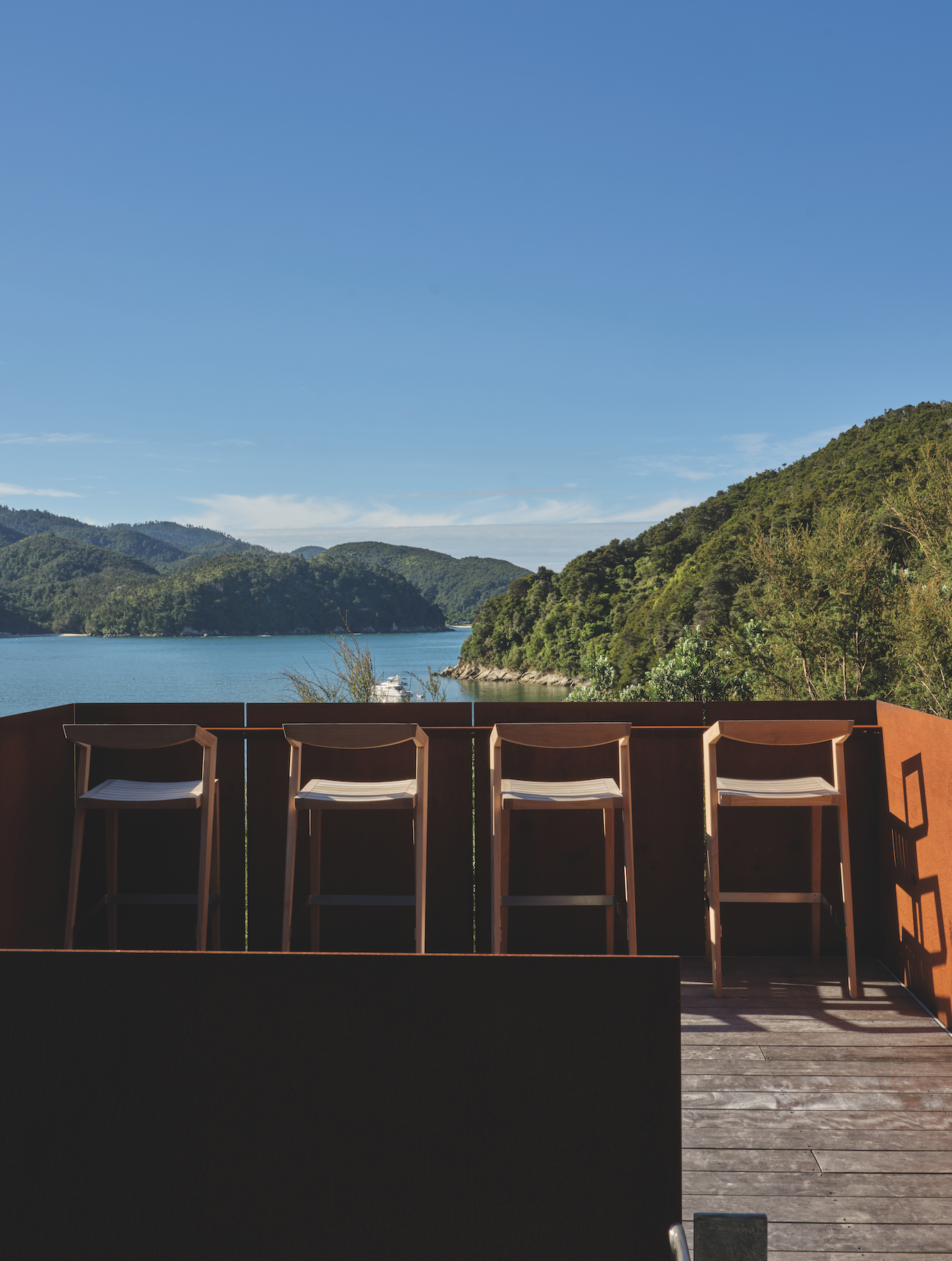All the materials had to be ferried in by barge and then carried on foot up the hill. As a consequence, the one-bedroomed cabin sits on just six piles and features Corten steel panels, limestone and timber in quantities that were light enough to carry. “It had to be really considered,” says Prue. “There was nothing we didn’t scrutinise or contemplate: how it was going to be used; how to store it once it was in there. It was a luxury to consider every detail and make purposeful decisions, which led to a calm, crafted space.”
