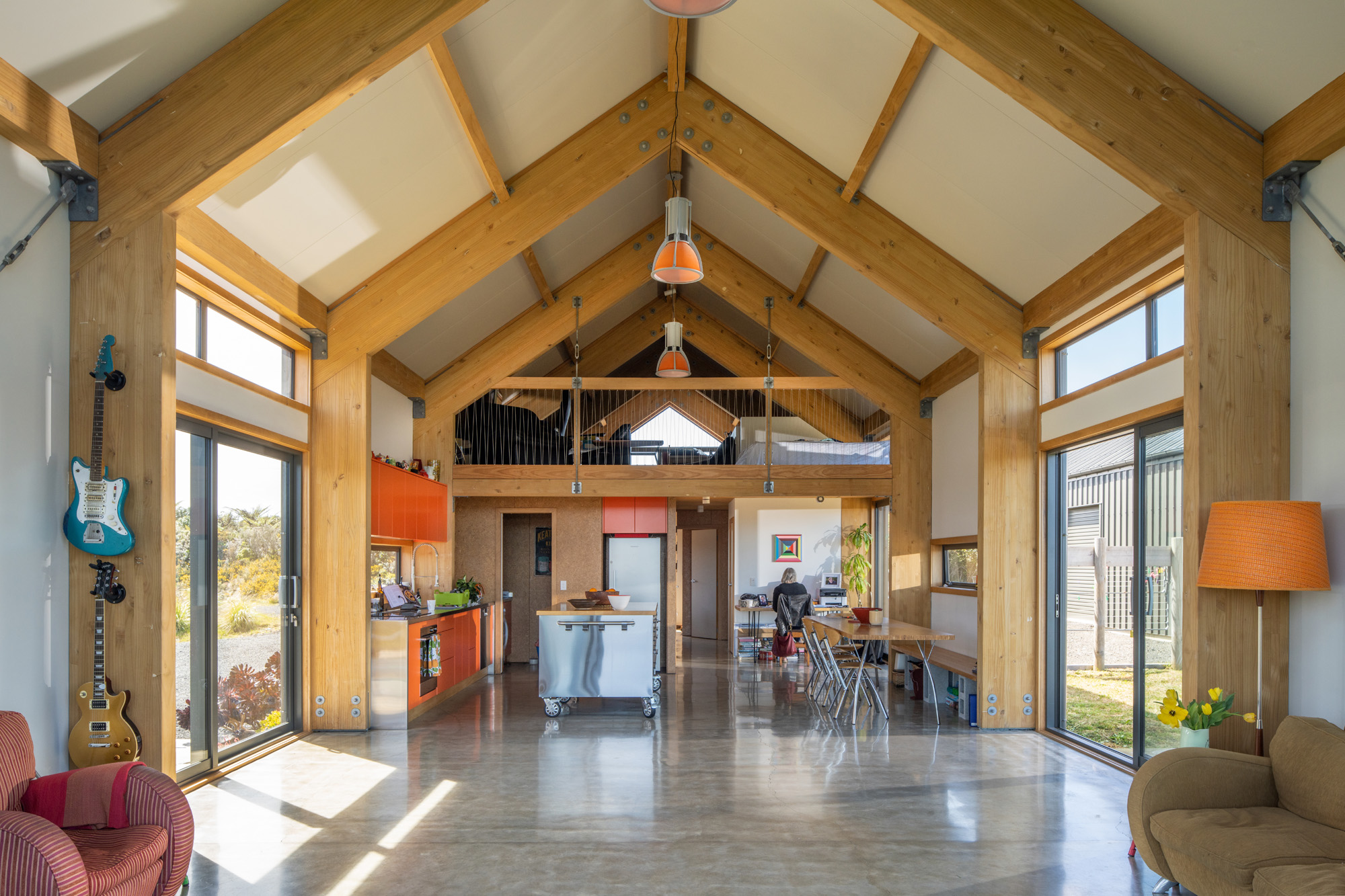 The double concrete slab with hydronic central heating, combined with the insulated panels, ensures the house performs well in often inhospitable conditions.