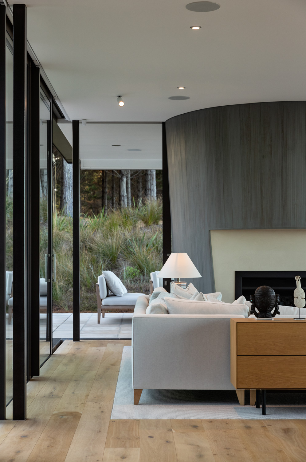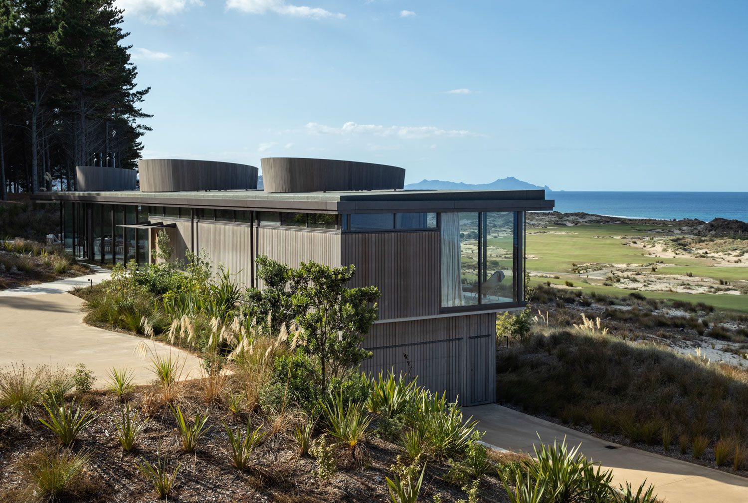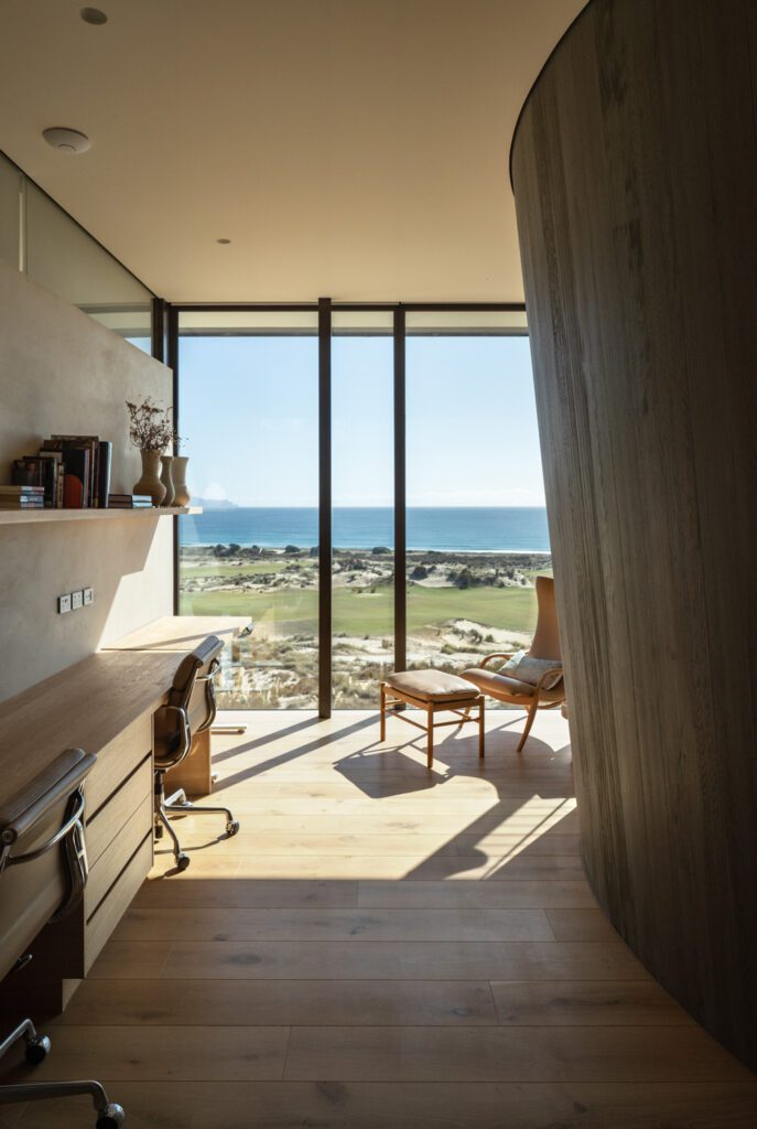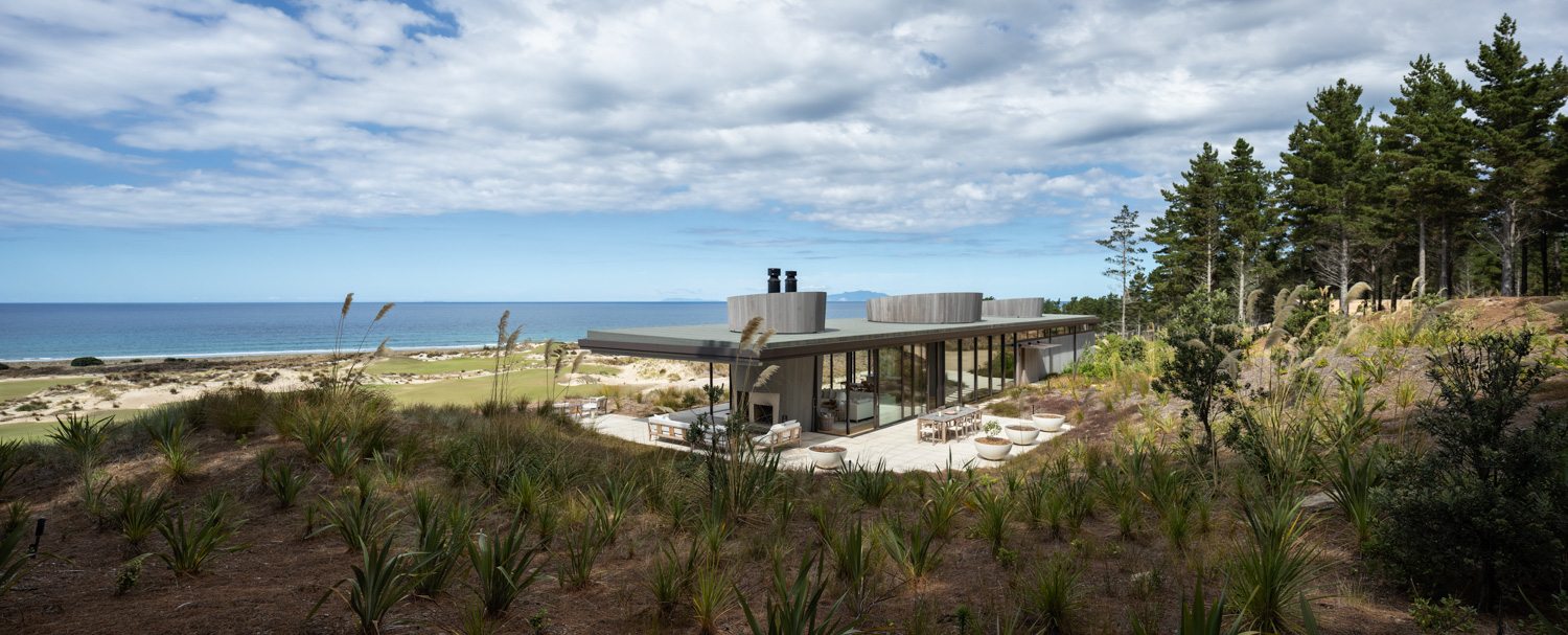 Within this Northland landscape, this editing or sculpting back until a form is revealed works particularly well. Set in the Tara Iti gated community — a sort of golf and architectural Disneyland — the house borders the remnants of a pine forest and the Tom Doak–designed links.