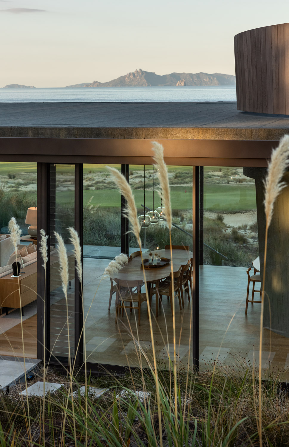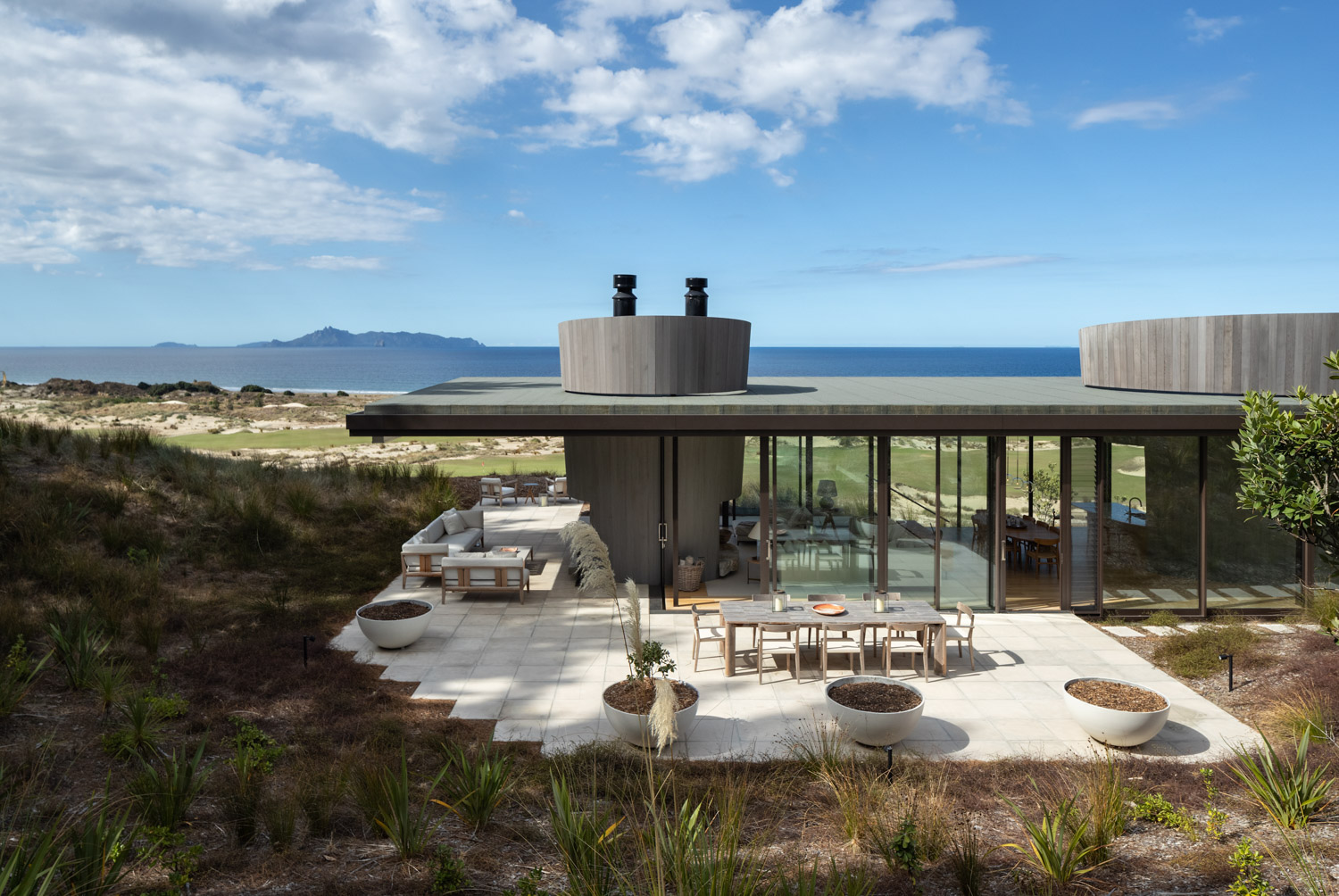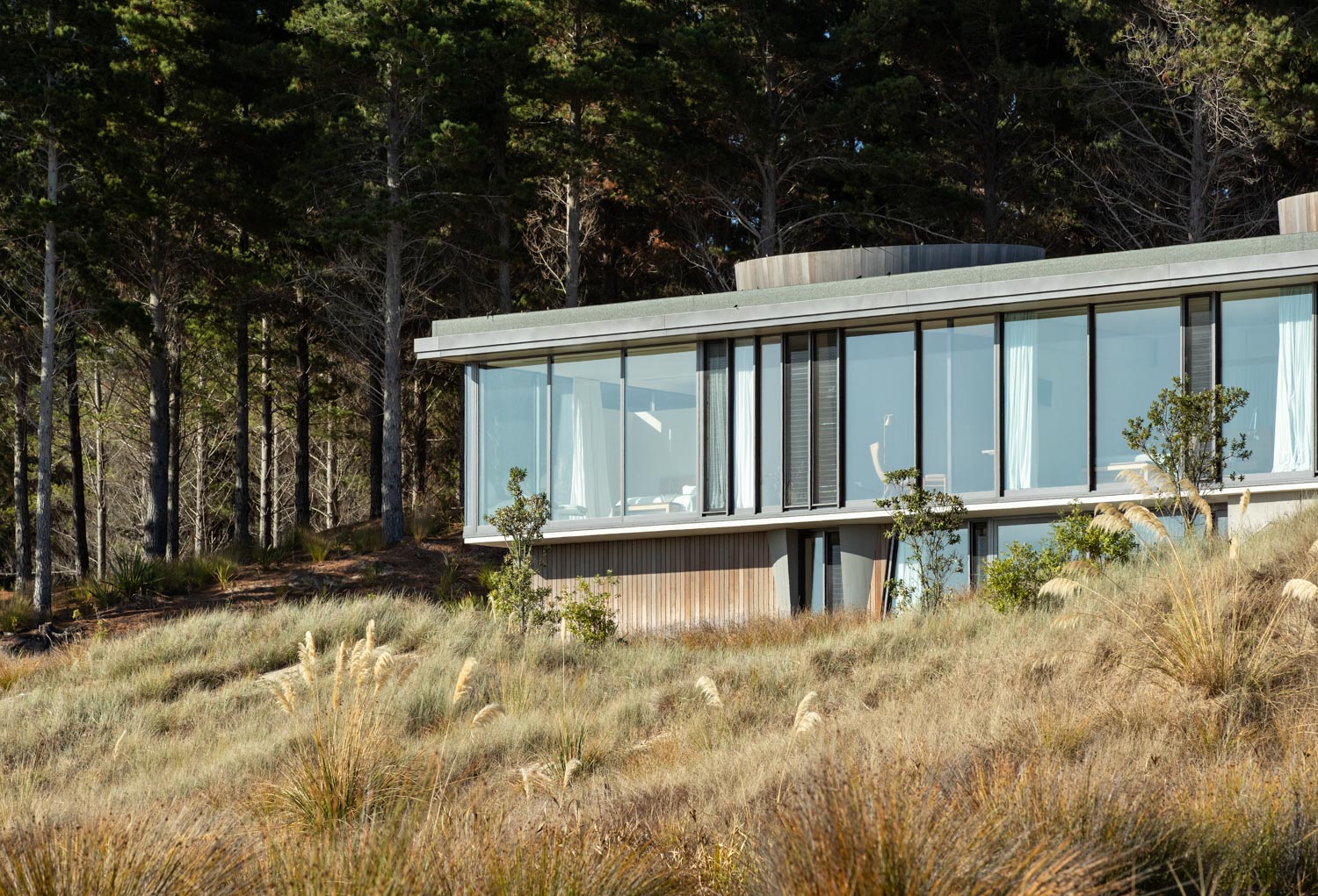 Within this Northland landscape, this editing or sculpting back until a form is revealed works particularly well. Set in the Tara Iti gated community — a sort of golf and architectural Disneyland — the house borders the remnants of a pine forest and the Tom Doak–designed links.