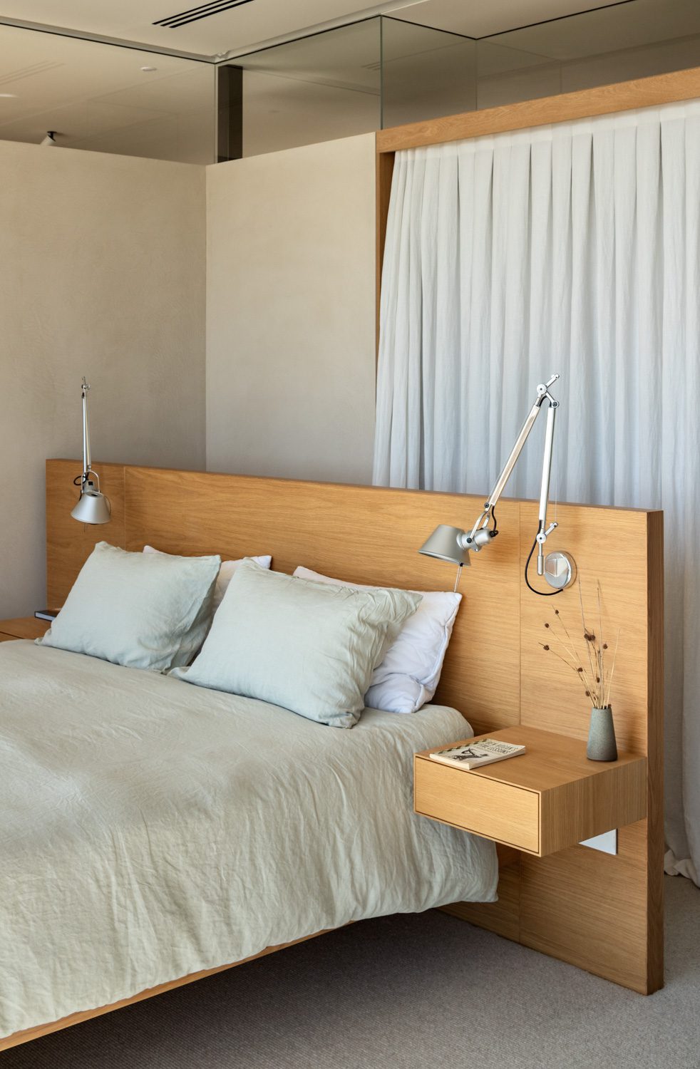 Hallways are defined by gently sloping conical walls and the exterior glazing. All air conditioning ducts have been recessed into the ceiling, glass doors slide back into the cones, joinery sections are buried below floor level, and there are no internal stairs connecting both levels of this house. Even the TV set has had an architectural intervention to maintain the purity of the space; it lives inside one of the conical structures and, when in use, it extends and cantilevers above the floor.