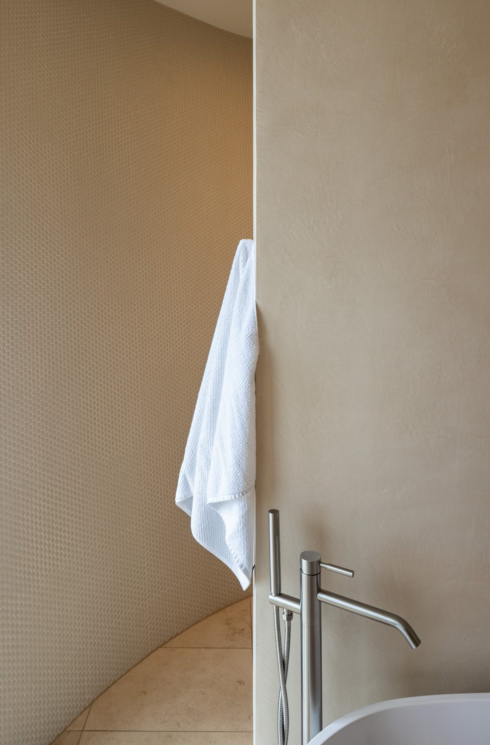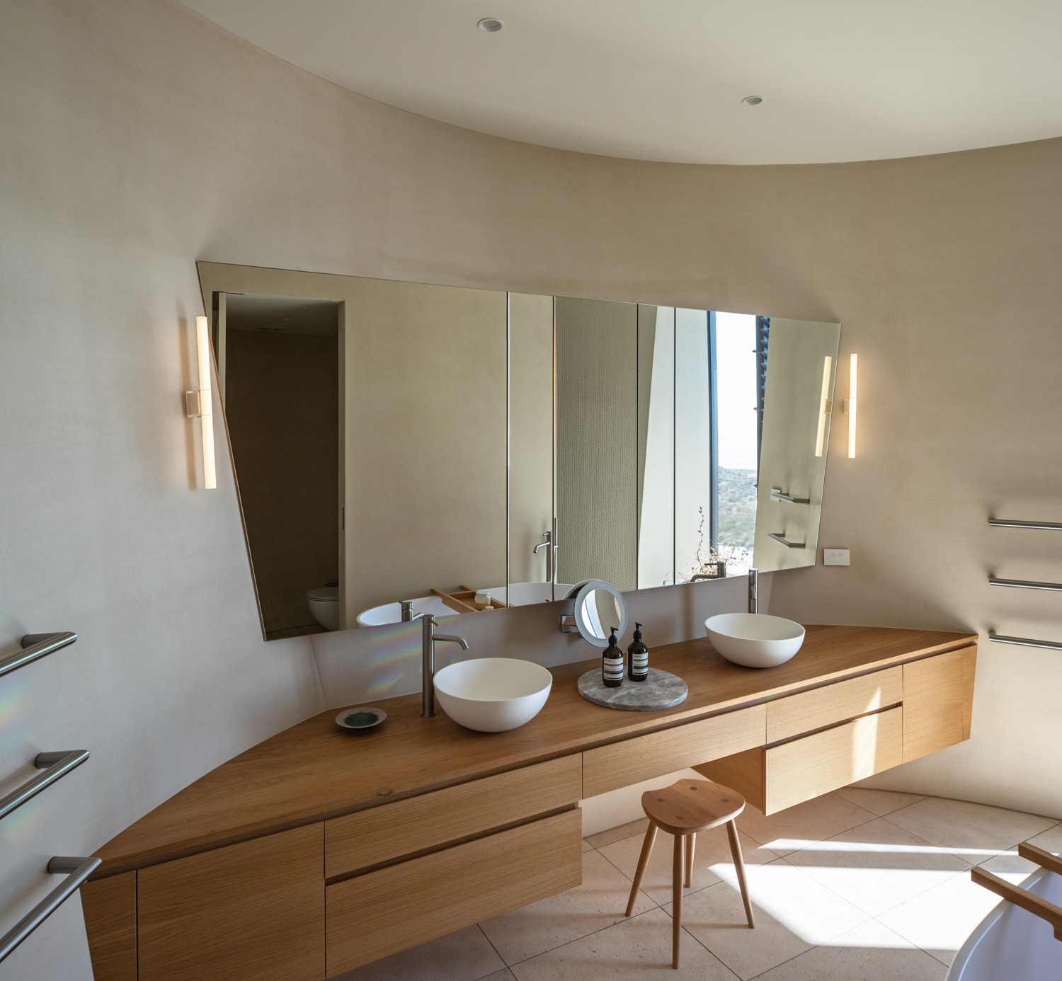 Nowhere is that more apparent than in the main bathroom and in the surprisingly diminutive kitchen, their blatant curvature alluding in part to art deco, in part to jet turbines; a form that echoes California and grand old cars from the 1930s but with detailing and palettes that are undeniably now. It is an old Chrysler with the rooftop down while on the stereo, instead of Louis Armstrong, something a lot more contemporary is wafting through the airwaves.