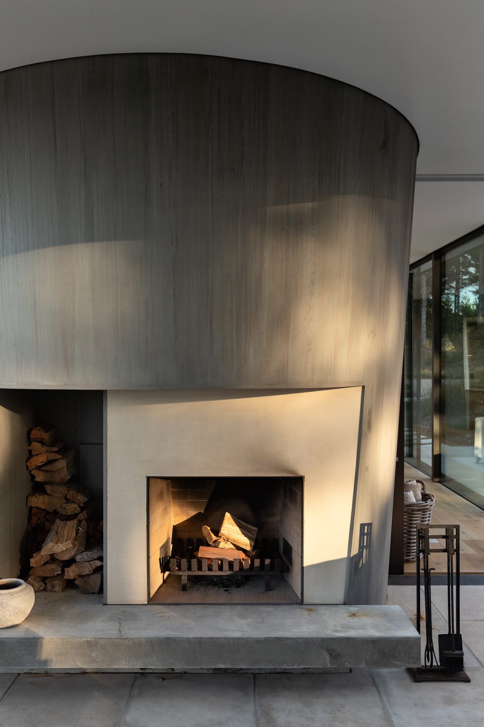 Looking at the house from the island’s perspective, one might be able to read its design as a simple pavilion with three inverted cones seemingly erupting through the rooftop and into the main salon. There is a solidity to these cones but their vertical timber cladding and the lightness of their rooftop edges lend them a certain lightness, as if sheets of paper had been twisted into darts of varying girths and inserted into a glass box.
