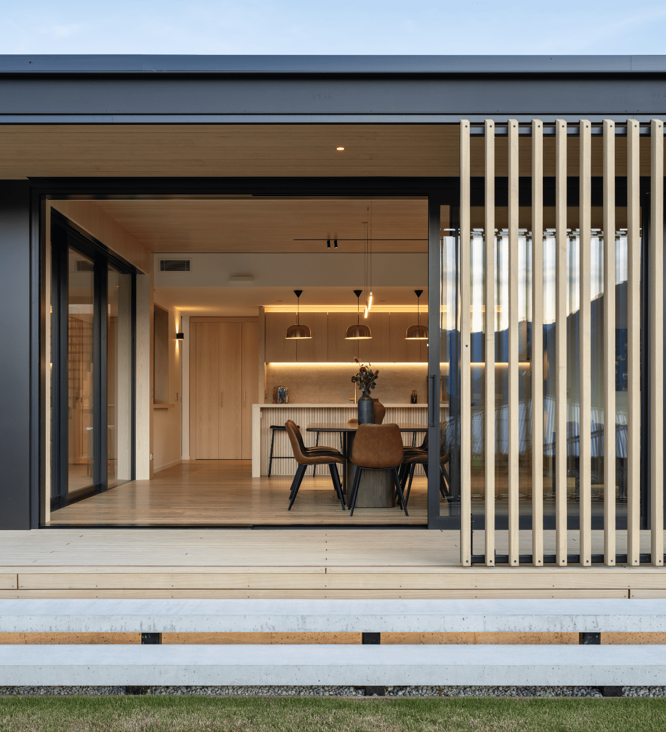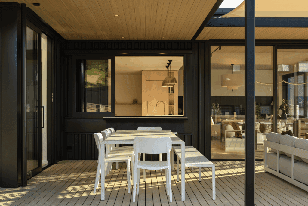 Rather than being wrapped within the wall frame, the framework is exposed in most places, which helps with thermal bridging. COLORSTEEL cladding was added, along with Abodo timber screens, decks, balustrades, and soffit linings.