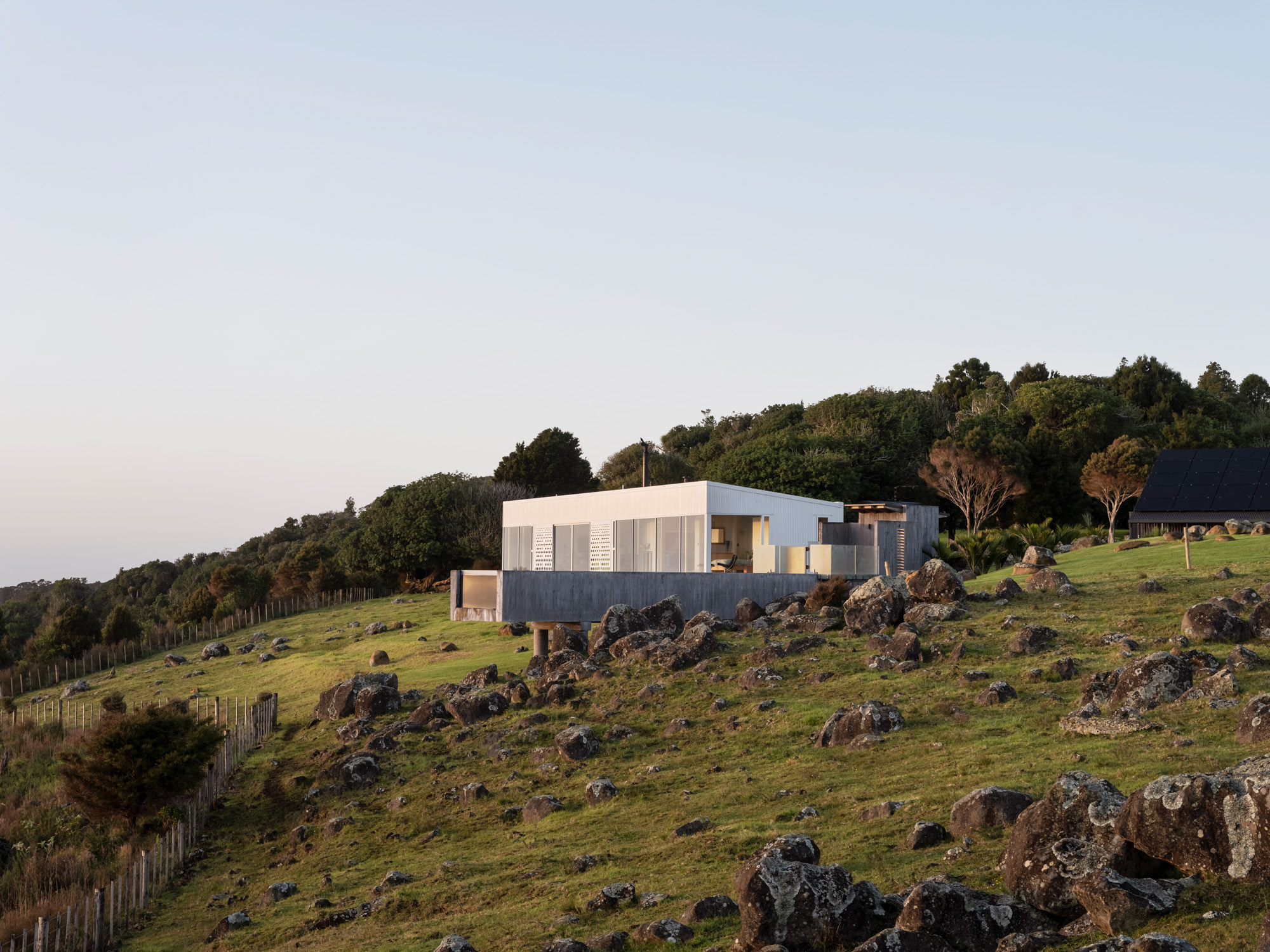 “The boulders are remarkable, as is the wider landscape and we didn’t want to encroach on it so the concept of an elegant box came about: a concrete floor hovering on piles that floats over the volcanic rock-strewn landscape. This was important to ensure no excavation was needed and the land remained intact,” Bret says.