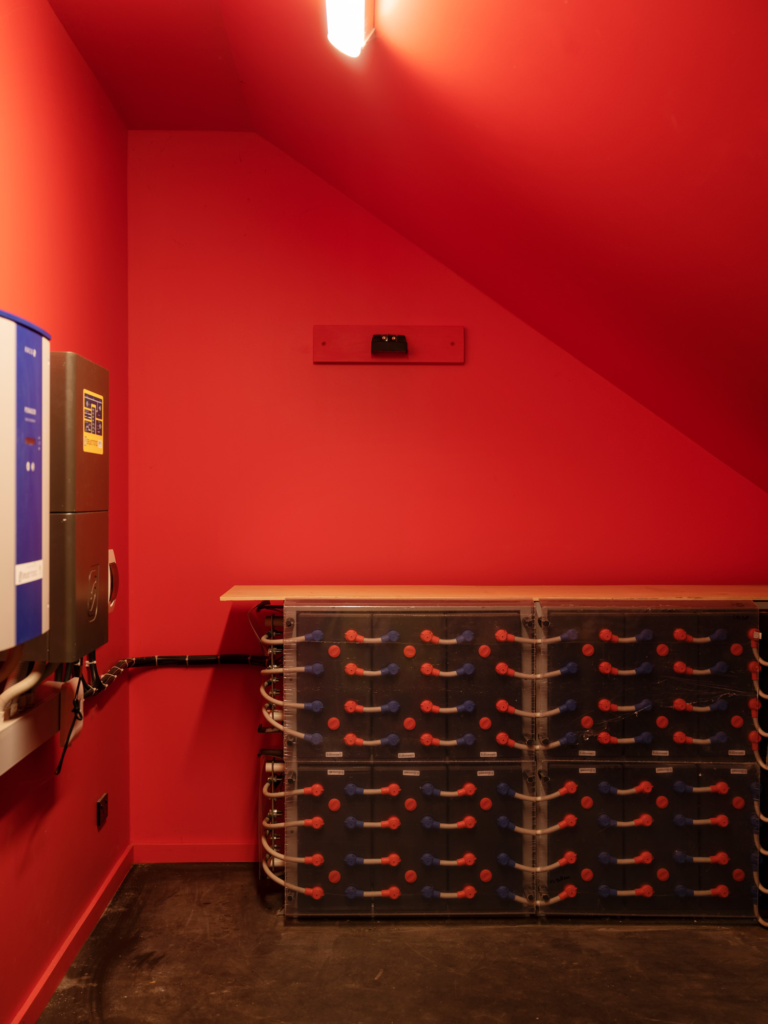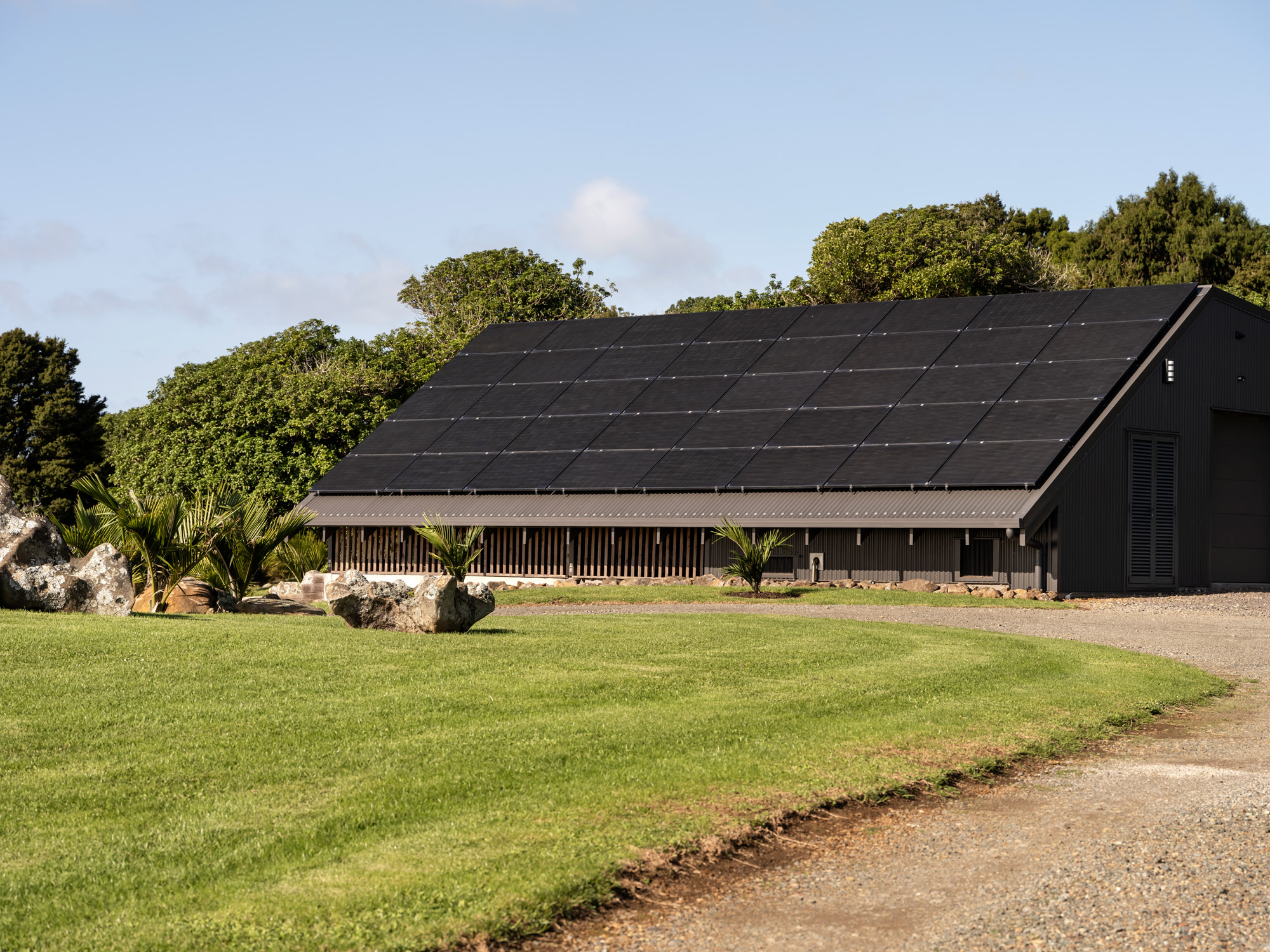 Behind these two diverse and somewhat decadent structures is the powerhouse; a garage designed to the exact specifications of a highly sophisticated solar panel system, and housing the battery bank.