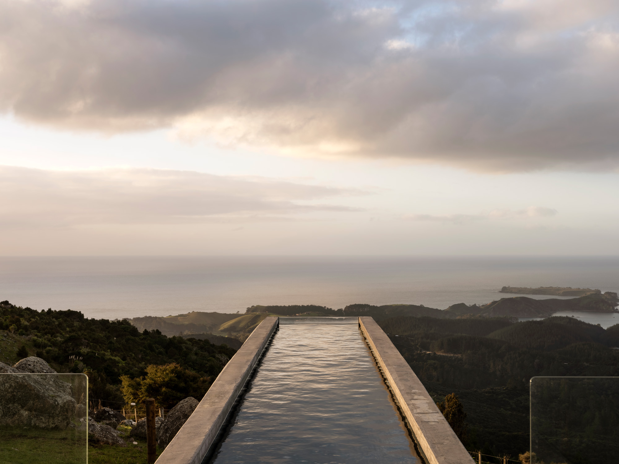 The house sits above a natural contour in the site; at right angles to it and a short walk away is the second primary structure – a concrete sauna house, sun deck and 19-metre glass-ended cantilevered lap pool that stretches out high above the land (three metres at its highest point) towards the ocean.
