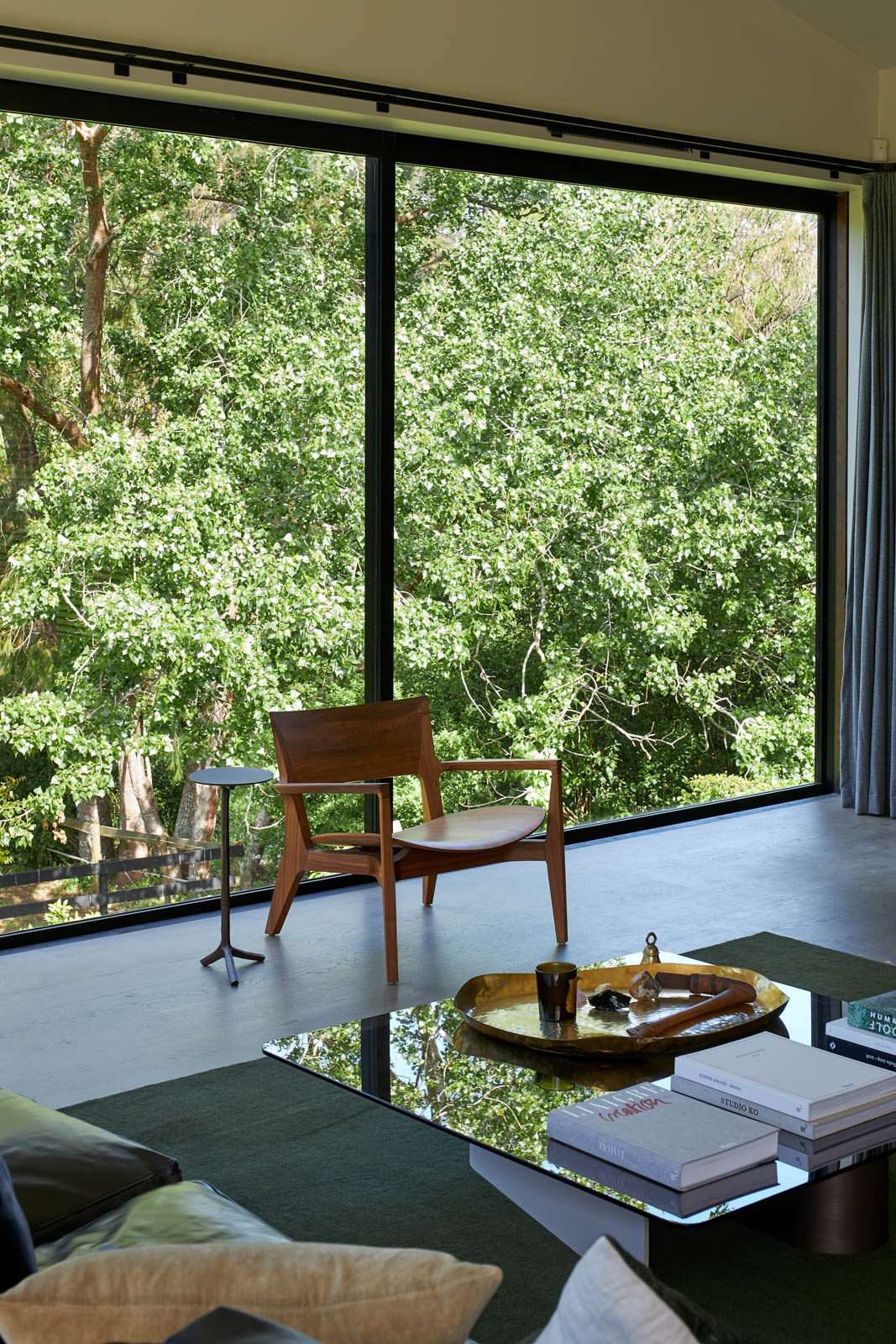 The exterior of the building has aged beautifully. Hay explains, “The material choices were something we took a little bit of time to settle on, but we haven’t regretted it.” The dark tone of the building in its green setting is striking, despite there being some initial nerves about the choice. “When it went up, it was quite bright. I was nervous on the first day that it wasn’t going to achieve the result that we wanted, but actually about within a month it was 80 per cent to where it is today.” The “dark and brooding” length of mass is layered and juxtaposed with dark, fine, metal shutters over the generous areas of glazing that were conceived with the “idea of filtering light”. The spaces that make up the home under the overarching roof element are planned simply, thoughtfully, and with elegance.