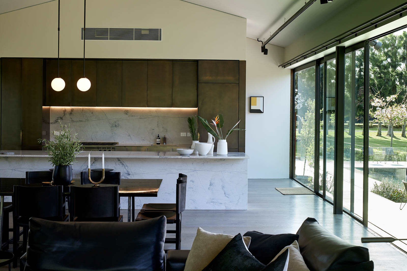 Hay tells us this is a special part of the home. “[This is] where we have our fireplace and lounge area and, on a winter day with a storm outside and the trees blowing, that’s my favourite time. There’s a sense of projection into nature … it’s a special place.” T he atmosphere inside the house differs from the darkness and solidity of the exterior. You move from the transitional space of the arrival lobby — clad in blackened cedar — to the gallery with its light French oak floors and light plasterboard walls, and then into the living area and kitchen, which gives a tasteful nod to the exterior with brass-lined cupboards. Landscaping — particularly the timber decking and swimming pool to the north — is bedded in and works effortlessly with the spaces it serves internally.