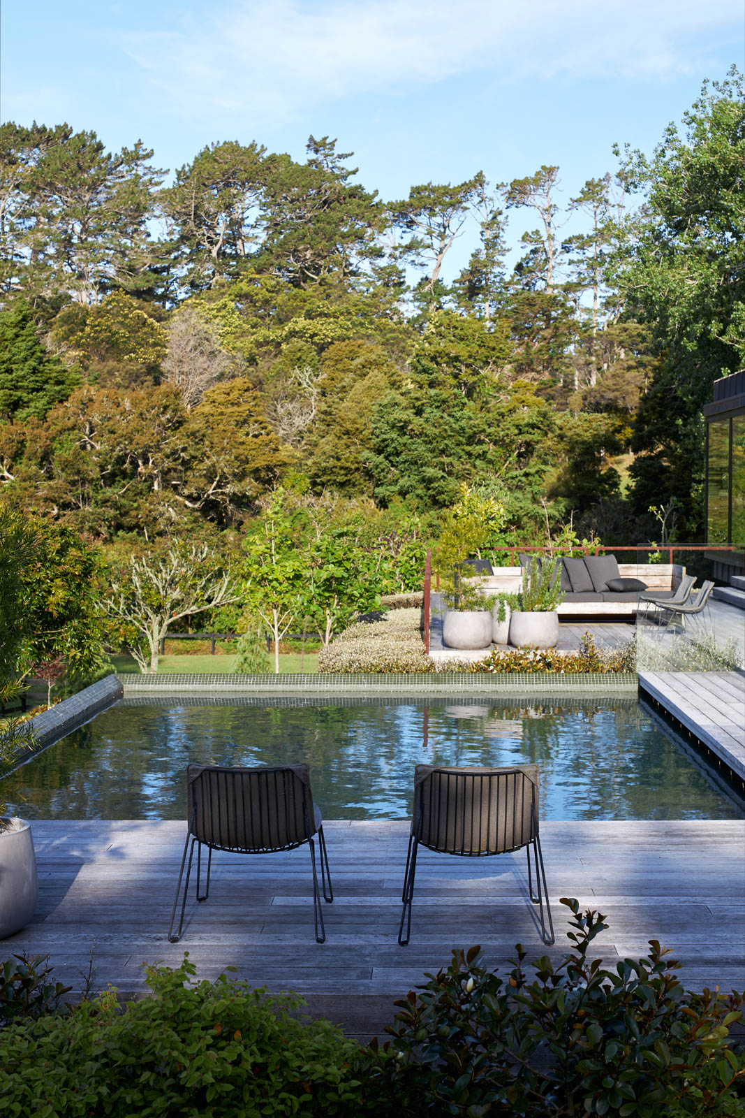 Tim and Alison Hay first occupied this home around 15 years ago. They had bought the site in north-west Auckland three years earlier when it was an old orchard with a number of paddocks. Tim, one half of the leading architecture practice Fearon Hay Architects, explains that they wanted something in the countryside, but close enough to the Fearon Hay studio in the city. The organisational elements that informed the planning of the house came naturally due to the richness of the site. The house sits within what was the shelter belt, testament to the grids and lines of the orchard, and is bordered by a stream on the boundary of the land, which wraps around the house.