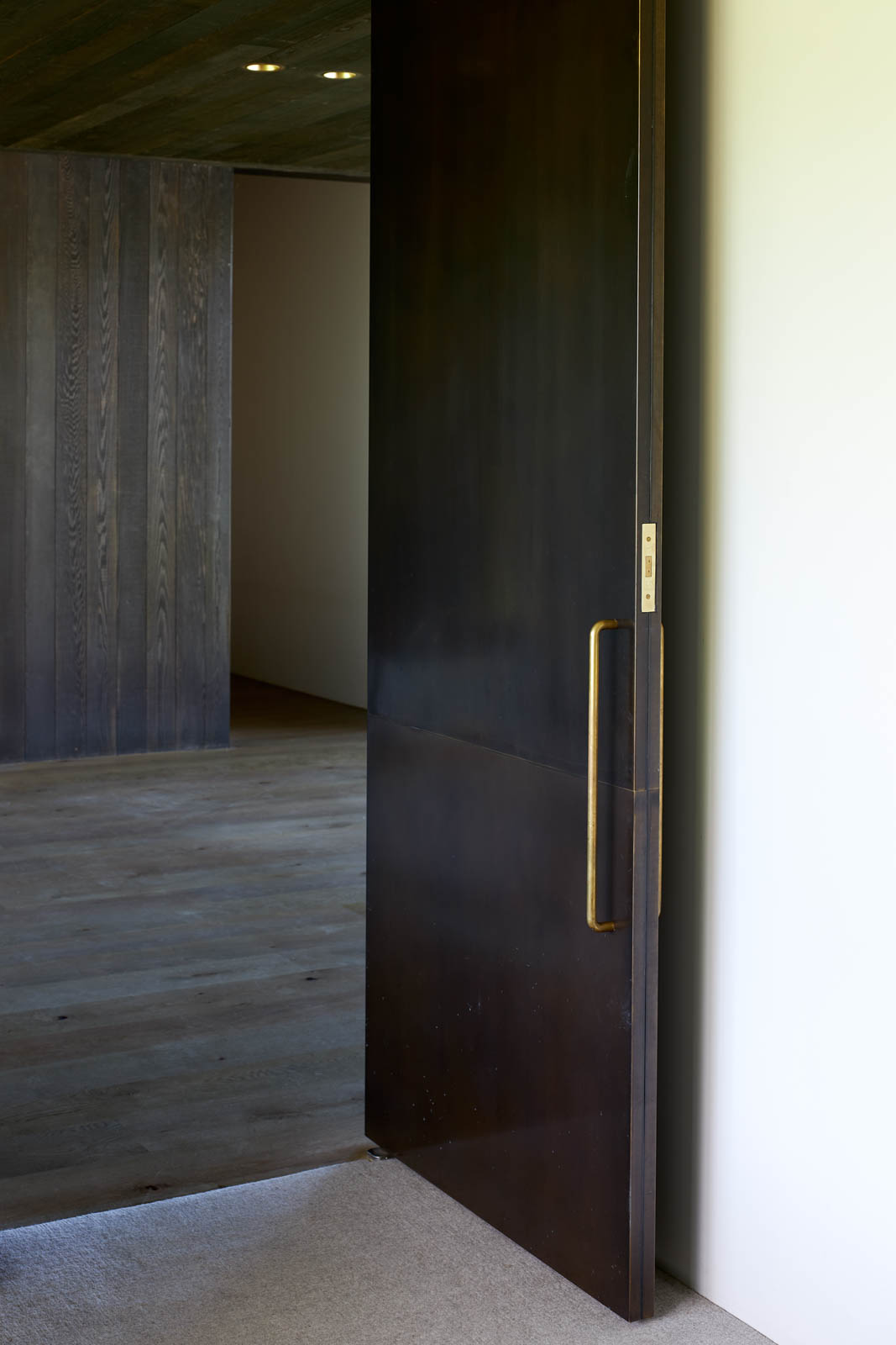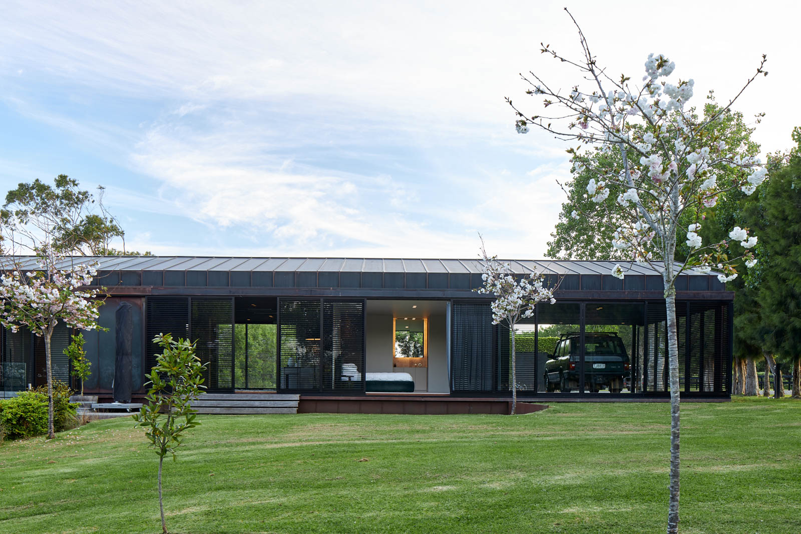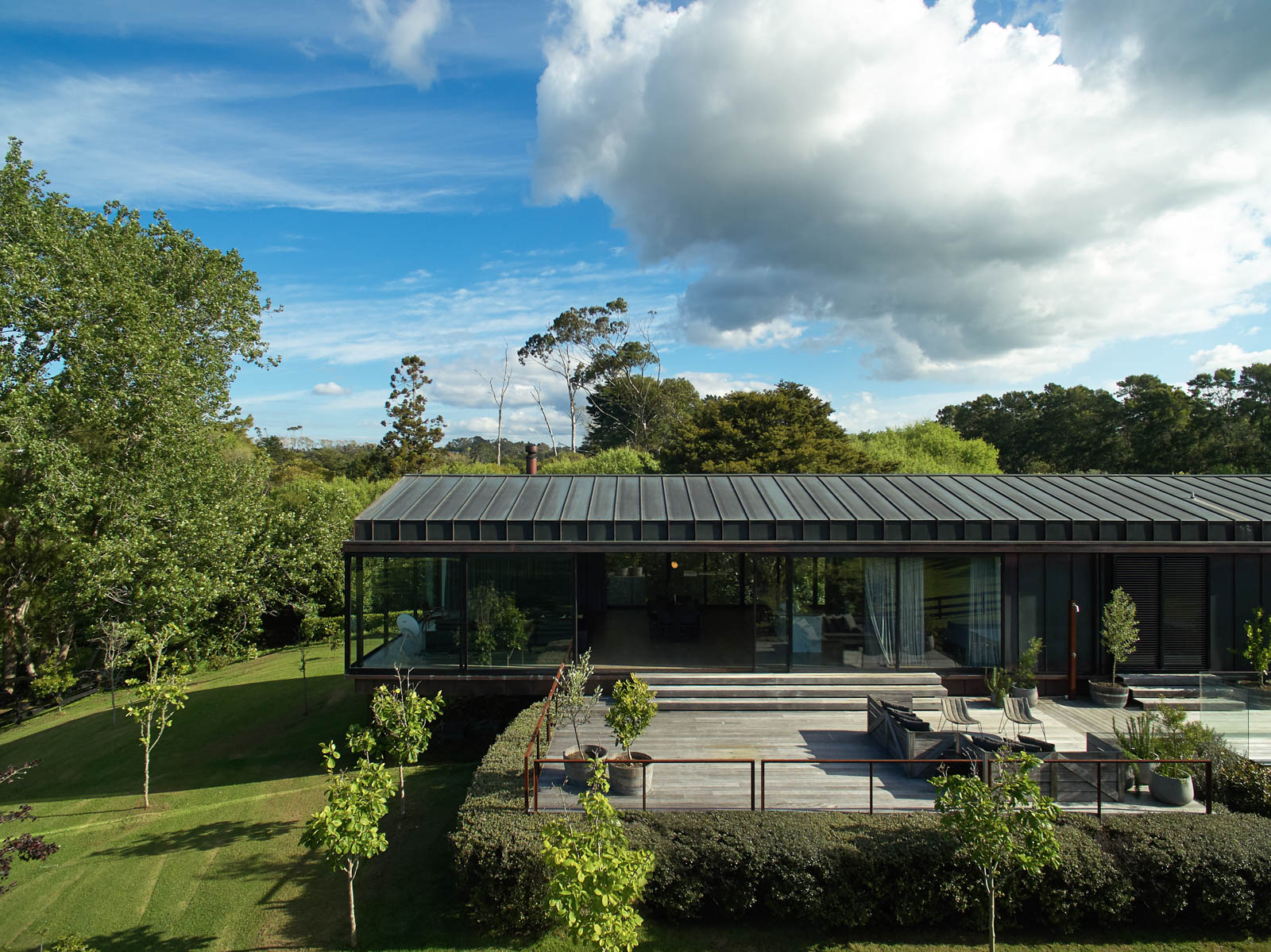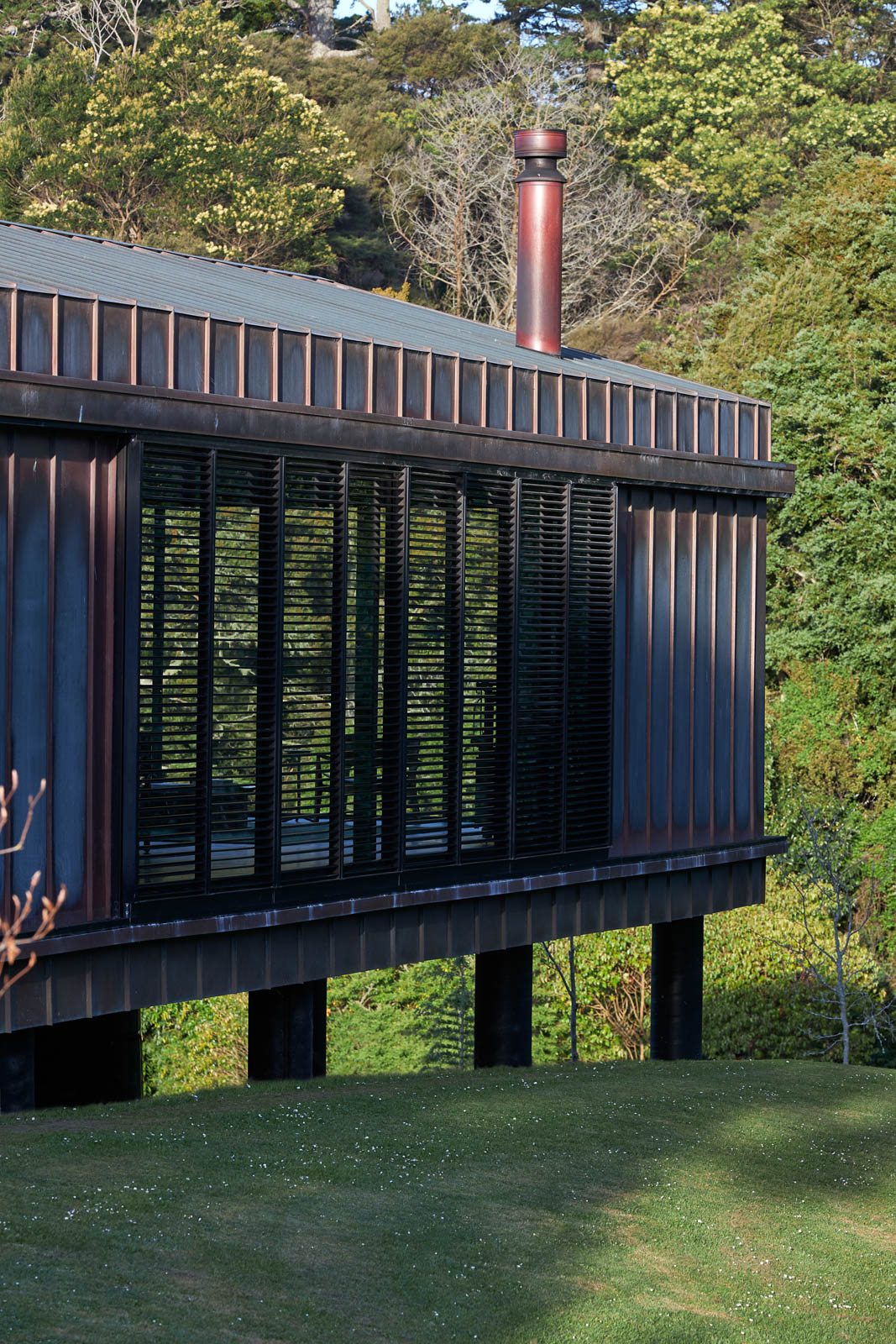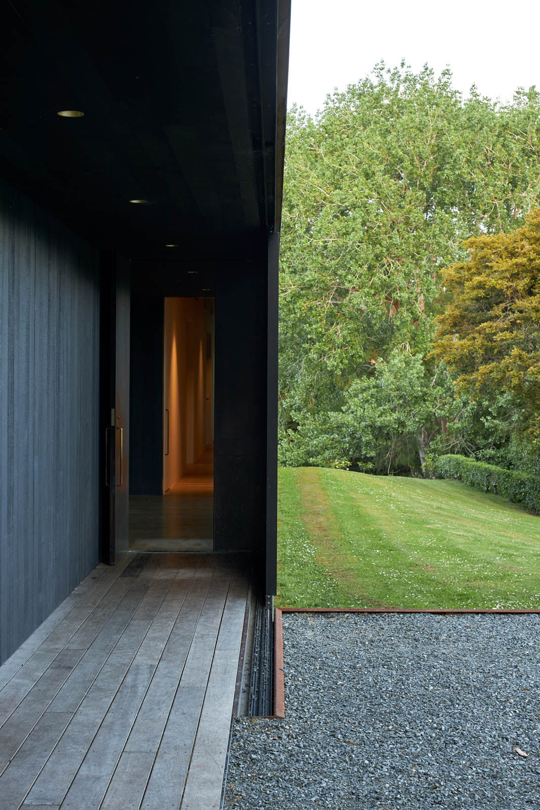 Today, the house reads as its name suggests. It is a long, narrow, single height, rectangular form that has been thoughtfully positioned on the orchard site. It sits gracefully, yet with strength, on the land. The house has a simple, pitched roof clad in copper standing-seam profile. The same material drops down the building towards the land to form the exterior walls, providing a “strength of one proposition — the idea of length and material all being quite singular”. The final form of the house is grounded upon arrival and then floats over the land that drops away at the far end, giving a “lovely sense of ground falling away from you — a sense of suspension in the valley”.