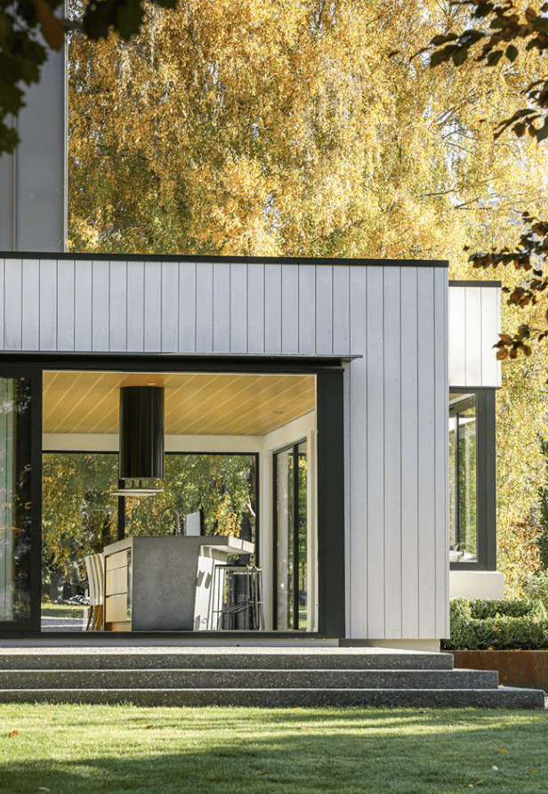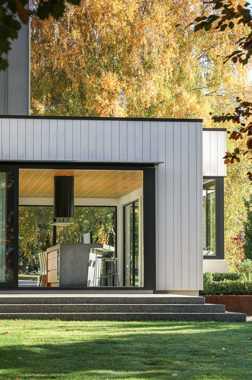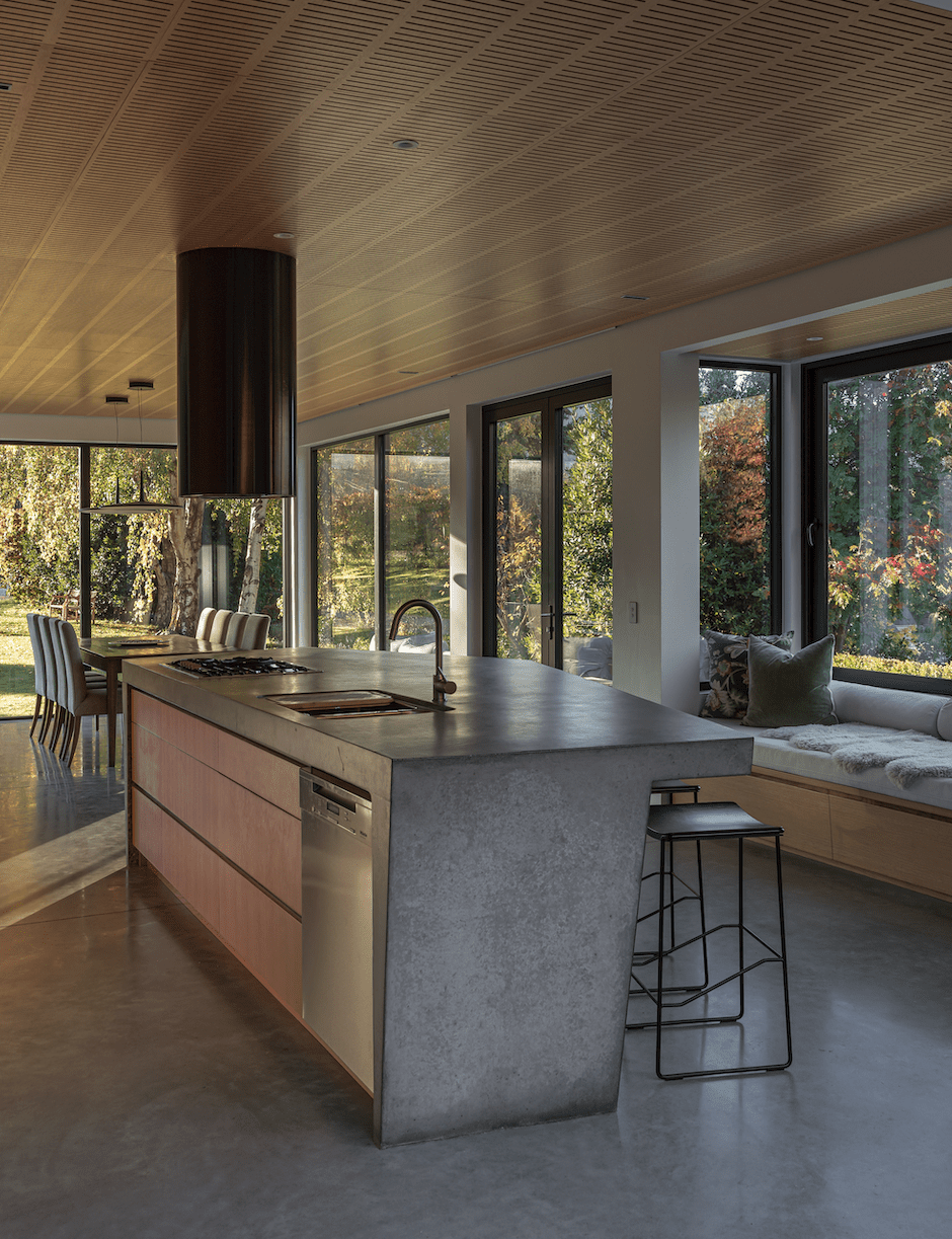 The kitchen and dining area is pushed out of the main form, creating a glazed box that has a sense of extending into the garden and a stand of trees adjacent to it. Clad in zinc and thermally modified timber, the substantial form sits lightly in the landscape — a fitting nod to the surrounding rolling terraces.