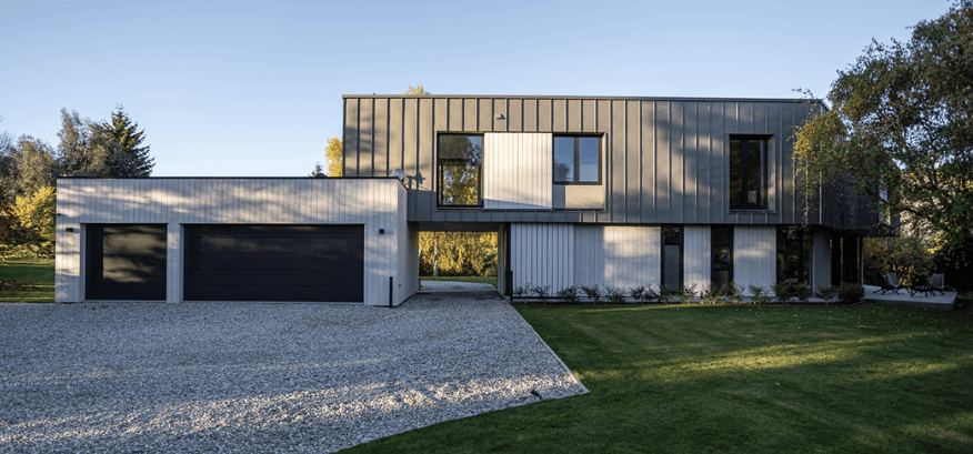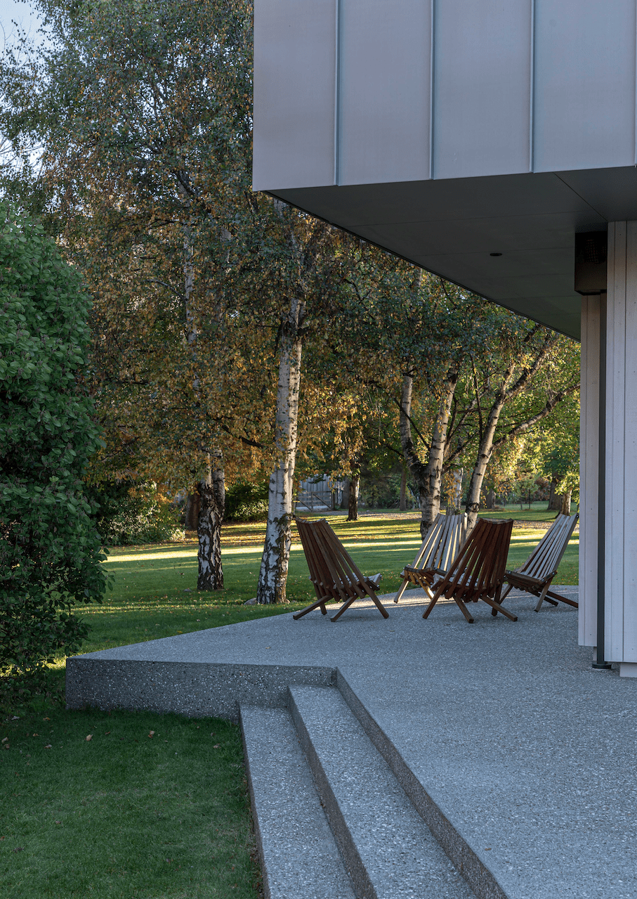 To take advantage of that, the house is laid out over two levels, turning its back to the lake and the wind; at its centre it meets and extends out in different directions. The top storey creates a bridging form that connects house with garage; at ground level, there is an opening between the two — accentuating the sense of solidity of the southern elevation and the void between its parts.