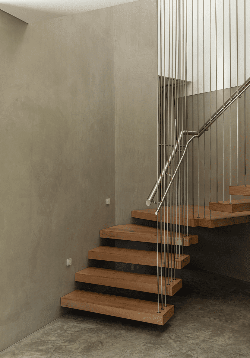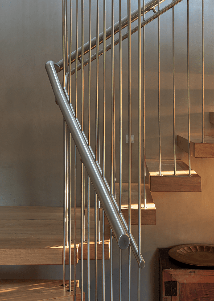 That’s definitely evident here. A playful double-height void is home to a visual and tactile feature: a floating timber stair surrounded by a balustrade of stainless-steel rods suspended from the hipped ceiling — waterfall like in its delicate flowing form.
