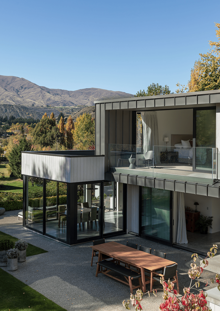 The roofline steps down from the centre in both directions; below, the kitchen/dining and garage form single-storey elements on either side. This meeting of roof forms at different elevations creates a sense of flowing, organic scale with a sharp angularity, much like the jagged peaks of the mountains around it.