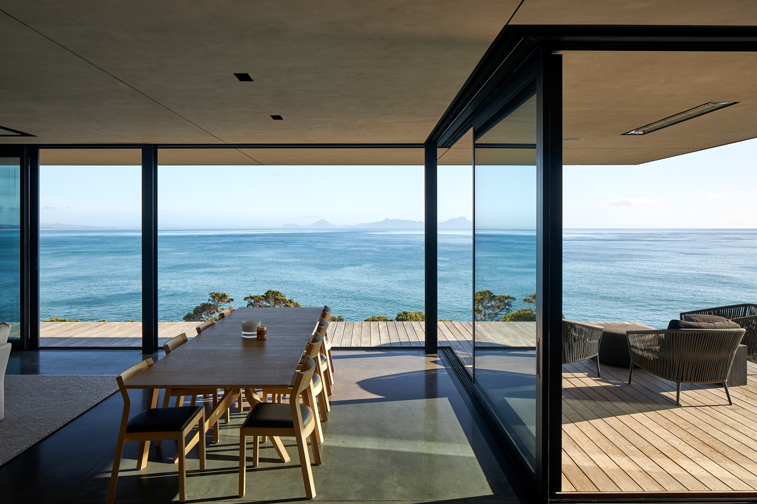 The house steps down towards the ocean, following the site and encompassing all-consuming views that force the internal and external spaces — they’re hard to distinguish — into the background.