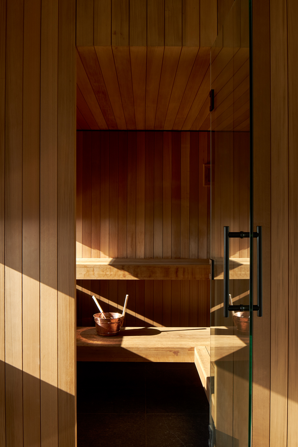 Upstairs, where privacy abounds in the master suite, the transition from the polished concrete floor of the lower level and public area of the home is apparent with the introduction of weathered-oak flooring — the same material used in the second bedroom pavilion. In both areas, white walls accentuate a delightful sense of floating above the ocean, every room turning outwards towards the sea. Even the cedar-clad sauna on the upper level encourages gazes across the ocean.