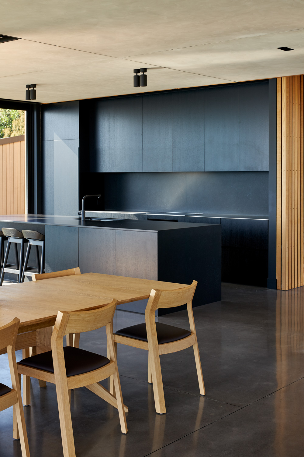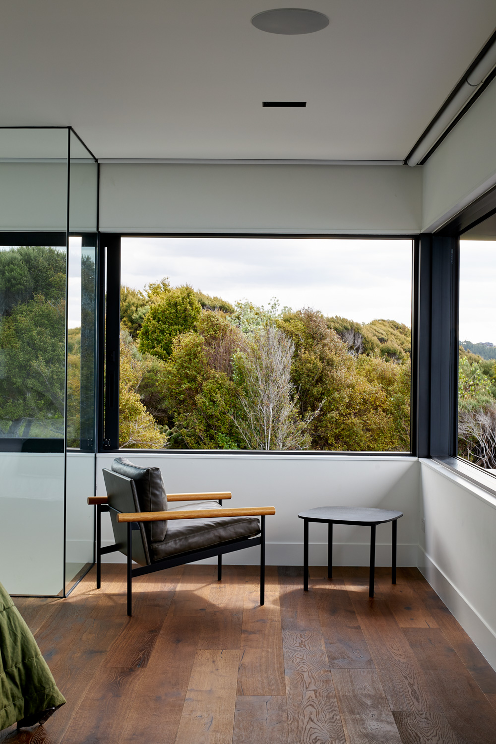“The headland shields the view of town and the site is next to a reserve, so there are no neighbours.” John’s big on arrivals, and this one is no exception. The split cruciform layout lends itself to a dramatic entry. “It’s a gap between two blocks that gives you a peek at the ocean views beyond — like a moth drawn to light, you are drawn to it.”