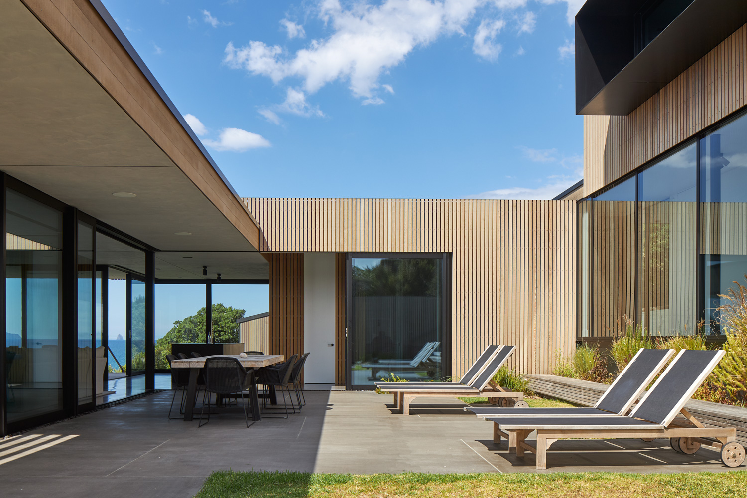 Three distinct areas of decking are arranged for use at different times of the day, while the fourth outdoor area is a courtyard, enclosed on three sides by the house, that comes into its own when the wind meets the exposed site. “We spend a lot of time sitting outside on the covered decks watching the waves, the birds, surfers, boaties, swimmers, and the sunsets, and when we’re lucky enough, dolphins, orcas, and seals,” Carolyn says.