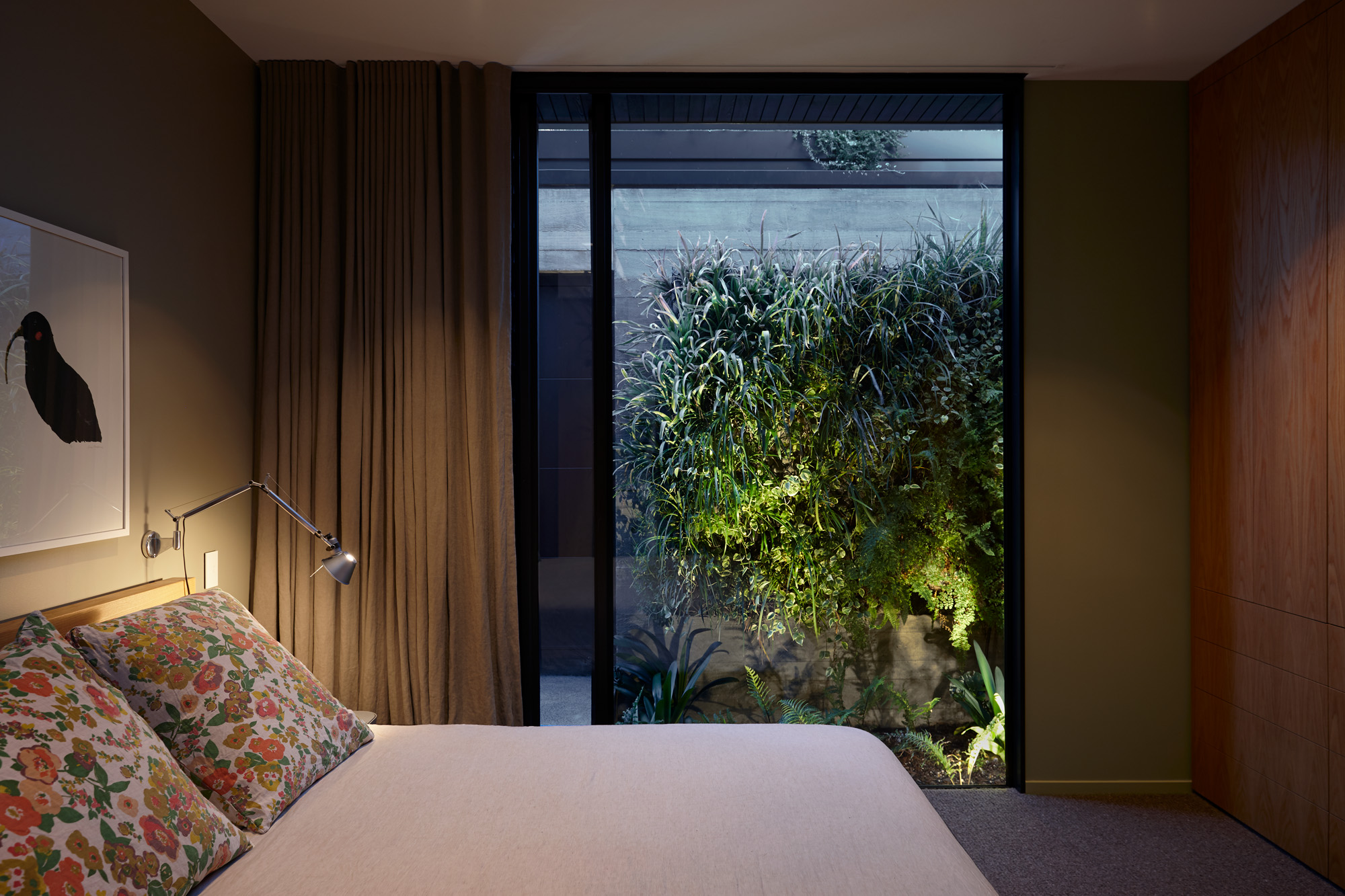 The master bedroom is east facing and looks out onto one of the garage walls, so planting became important here. With the green roof planting starting to trail over the edges, a vertical garden was devised to create a natural artwork for the bedroom vista, and eventually meet the trailing plants above.